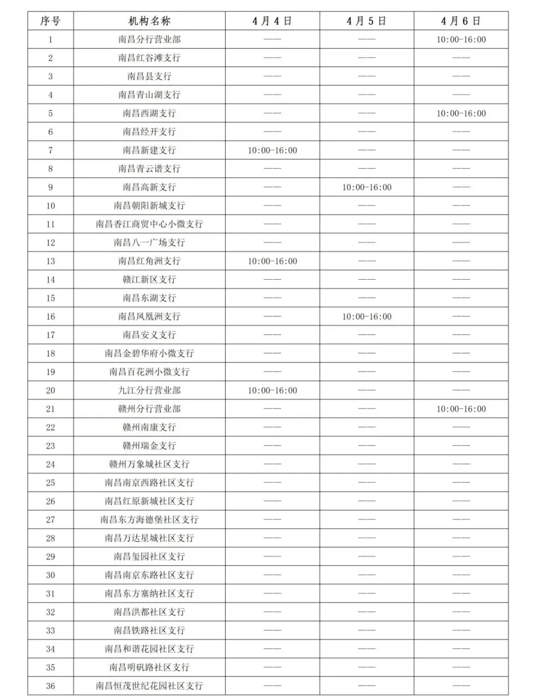 一、清明放假期间,北京银行南昌分行各网点采取轮流营业的方式,各网点营业时间安排见附表。
