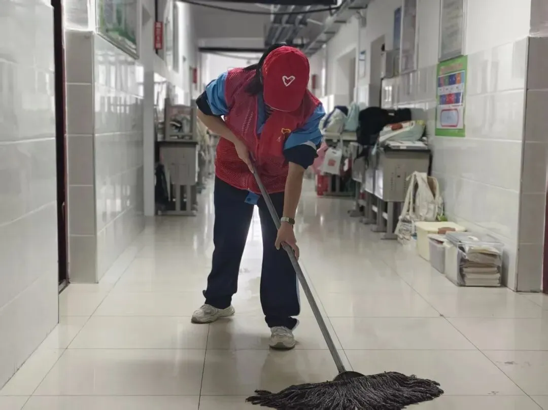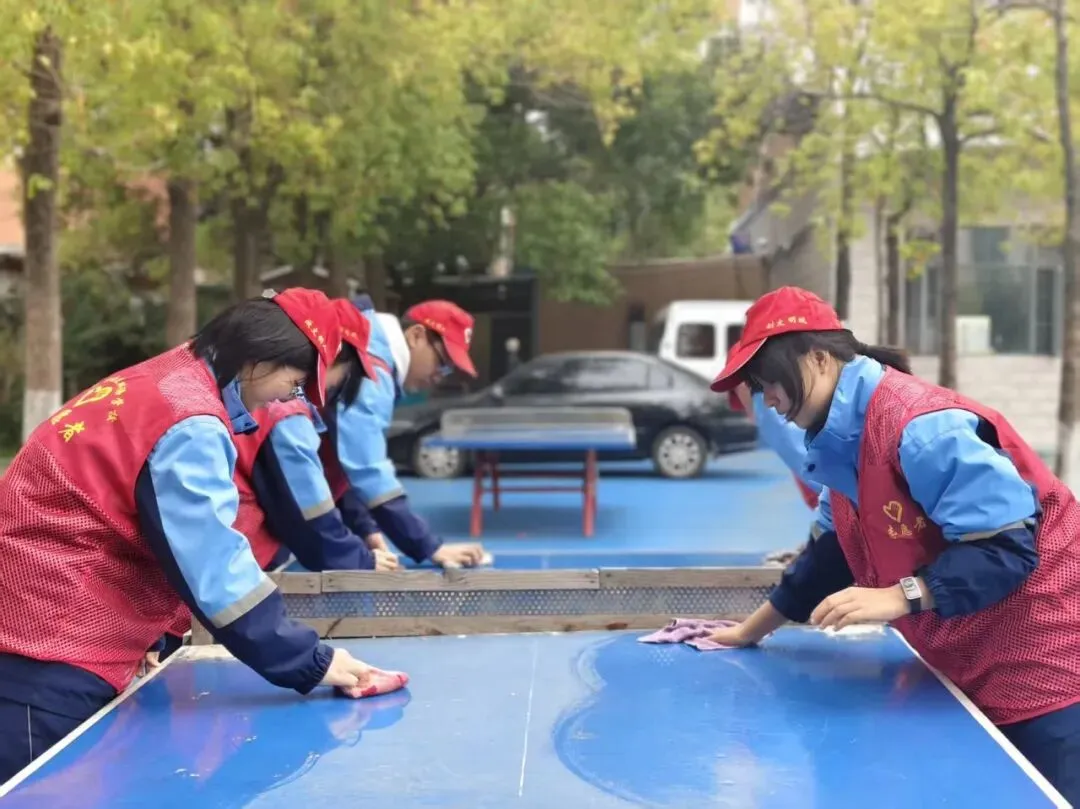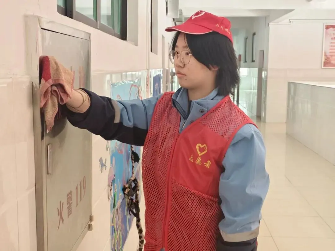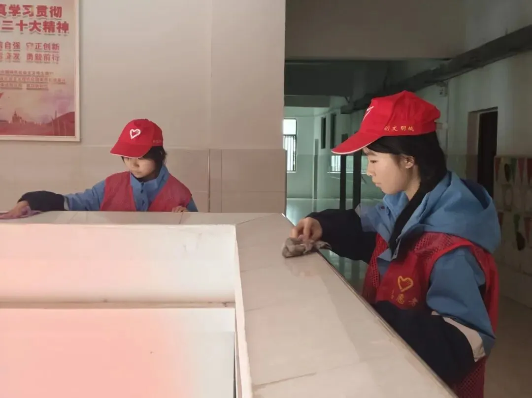 以党建带团建,组织党员与学生志愿者分组行动,开展“校园深度清洁”专项行动。志愿者们对教学楼走廊、楼梯扶手、操场健身器材、食堂外围墙面进行全面清洁,重点擦拭污渍、清理卫生死角、养护公共设施。大家分工协作、不怕脏累,以实际行动美化校园环境,践行劳动精神,共同打造整洁有序、温馨舒适的学习生活空间。