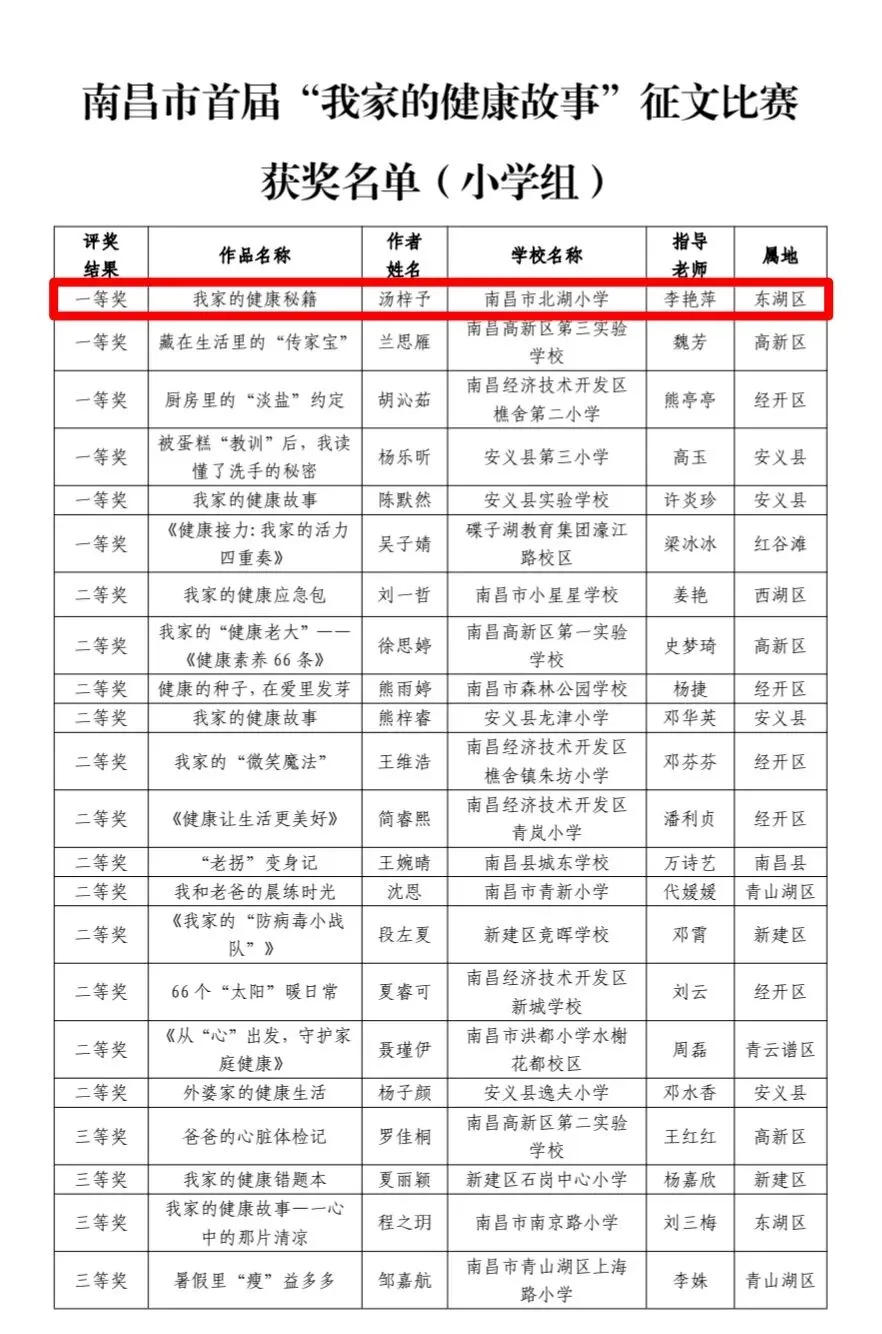 在南昌市首届“我家的健康故事”征文比赛中,南昌市百花洲小学教育集团北湖校区的汤梓予同学凭借作品《我家的健康秘籍》,从全市众多选手中脱颖而出,荣获小学组一等奖!指导教师:李艳萍。
