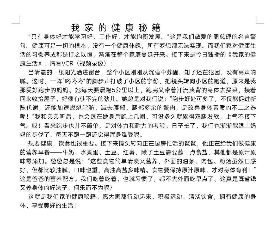 汤梓予同学以生动真挚的笔触,记录家中坚持晨跑锻炼、清淡健康饮食的日常,用文字传递科学健康理念,展现积极向上的家庭风貌,充分展现了北小学子的优秀素养。