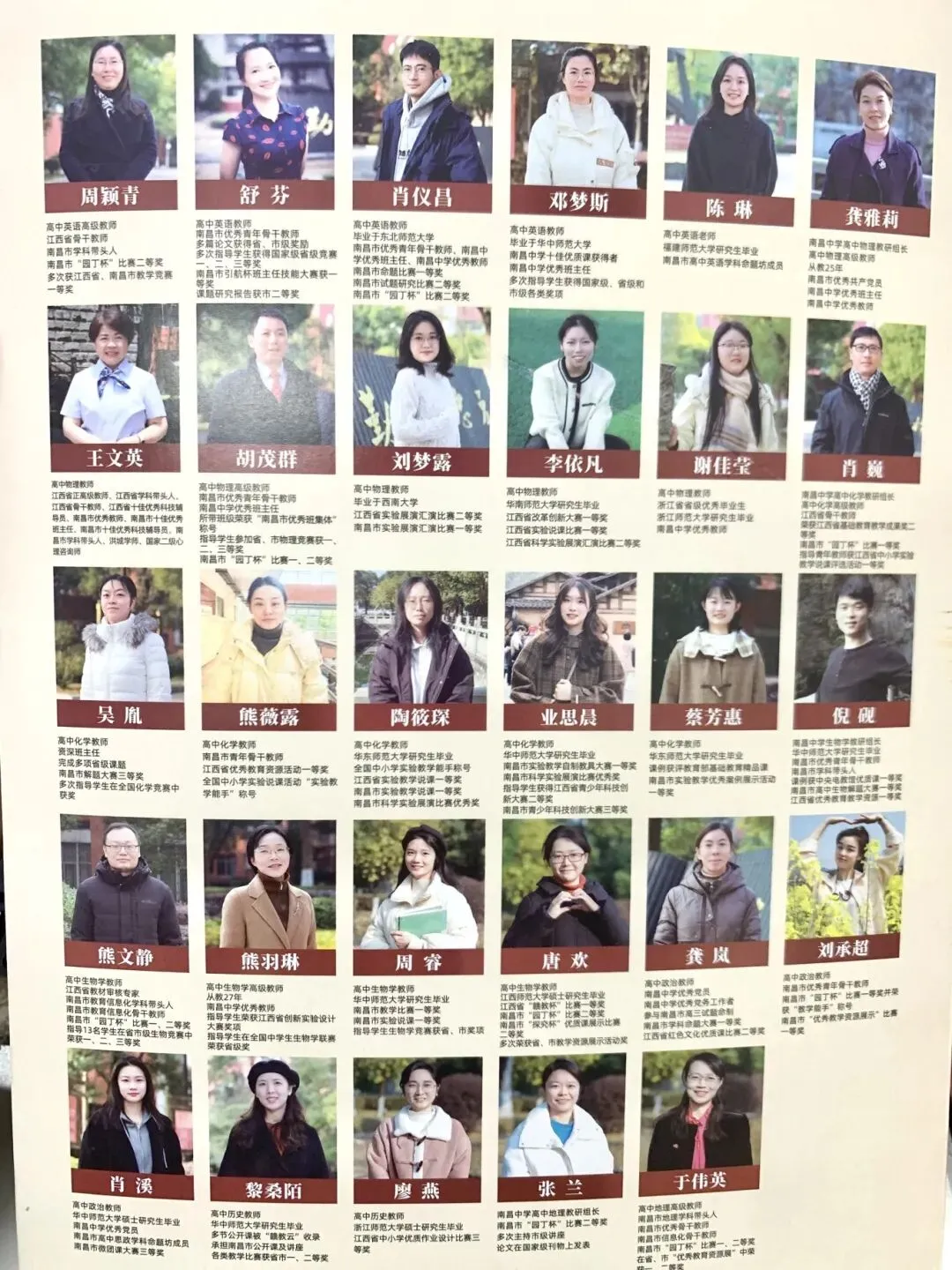 南昌中学九龙湖校区(总校)汇聚了原南昌三中名师、全国遴选名师、全市高中选调名师,构建起一支理念先进、结构优化、专业突出的教师队伍。教师普遍具备三轮以上高中循环教学经验,半数参加过省级教育科研项目,30余人荣获国家级教学竞赛奖。高考“双一流”升学率、特控上线率稳居南昌市前列。