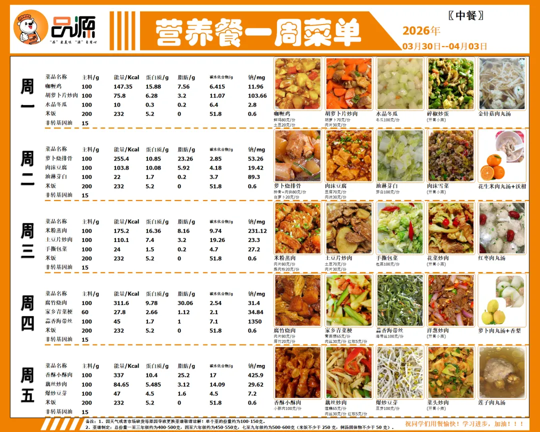 【第五周(2026年3月30日-4月3日)带量食谱公示】