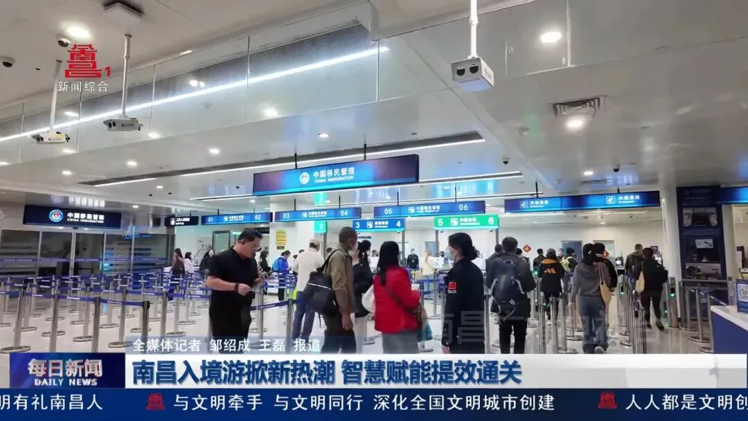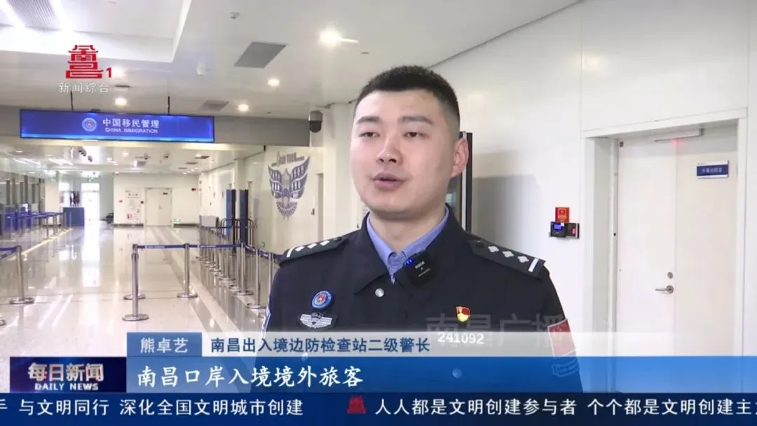 南昌出入境边防检查站二级警长熊卓艺:“(今年)截至目前,南昌口岸入境境外旅客,包含港澳台旅客3100余人次,是去年同期的5.4倍,其中,使用单方面免签、240小时过境免签等便利政策入境的外籍旅客占比超90%。”