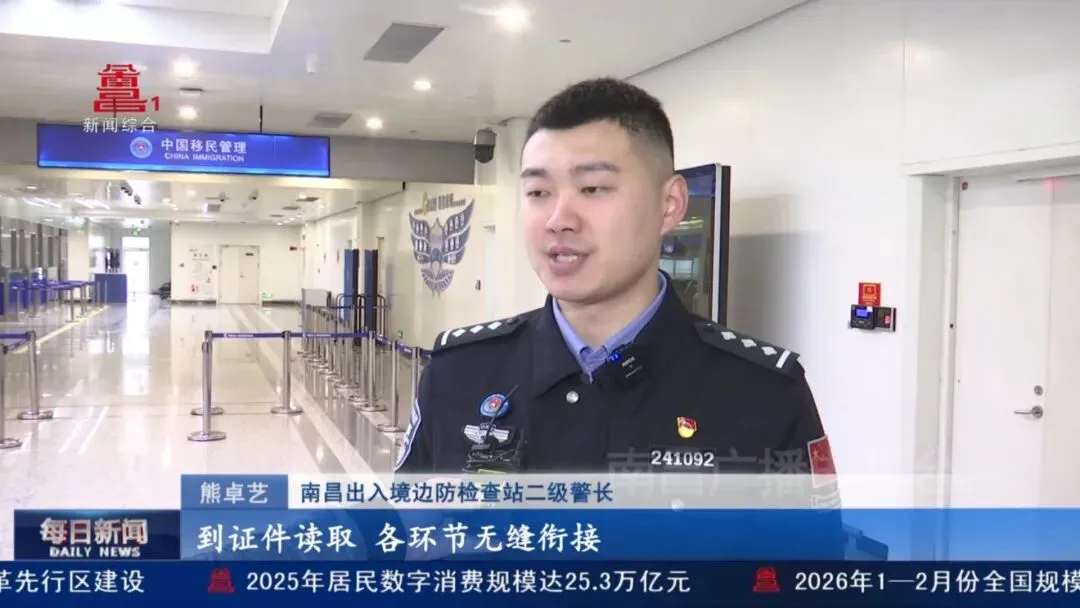 南昌出入境边防检查站二级警长熊卓艺:“我们全面升级了口岸查验设施,目前出入境旅客全流程已实现了智能查验设备的覆盖,从人脸识别、指纹核验,到证件读取各环节无缝衔接,出入境整体效率提升了15%。”