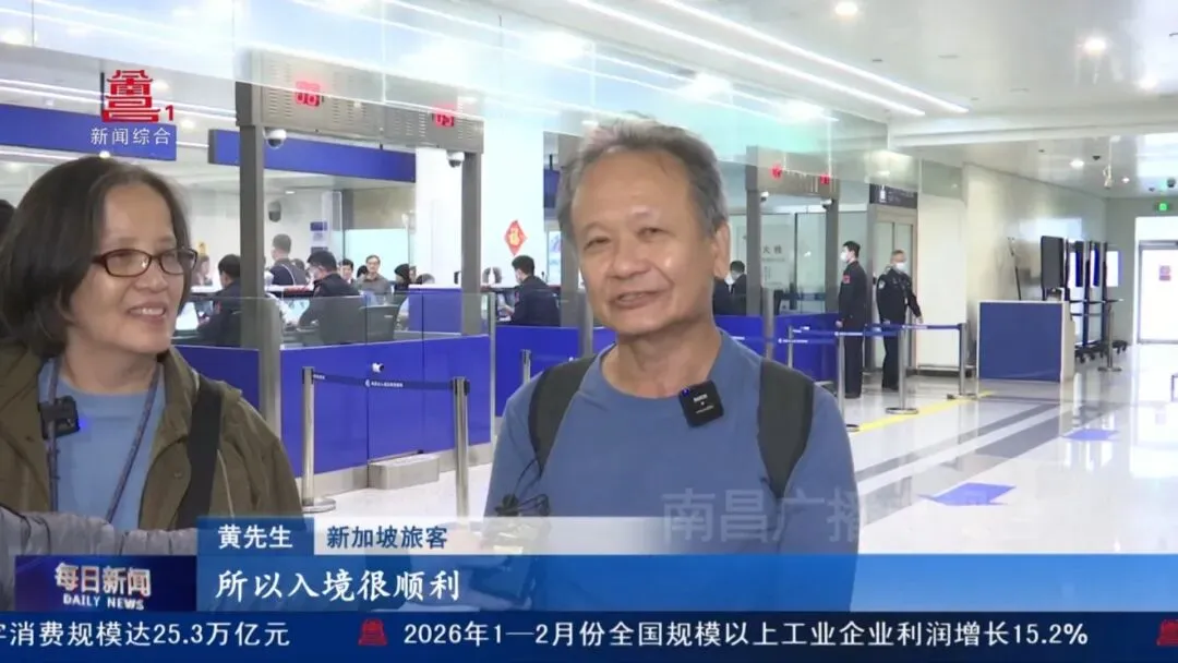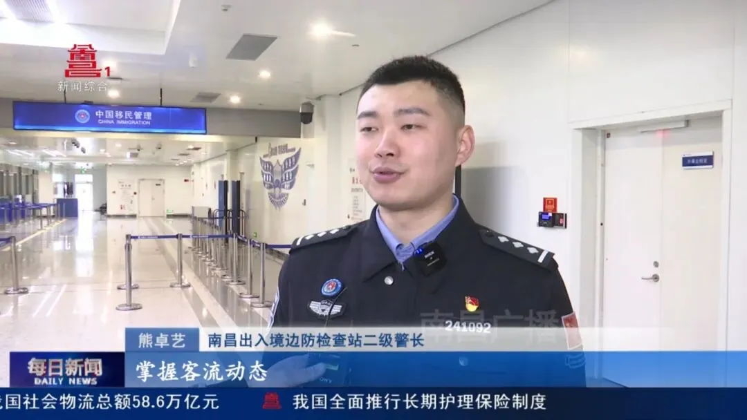 南昌出入境边防检查站二级警长熊卓艺:“南昌边检站提前对接航空公司及旅行社,掌握客流动态,科学调配警力,开足查验通道,同时,针对部分老年旅客及首次来华旅客,边检现场还专门设立了'党员先锋岗',安排精通外语的骨干民警,耐心解答关于签证政策、行程规划、交通换乘等问题,让异国他乡的旅客在踏入国门的第一刻,就感受到中国的热情与好客。”