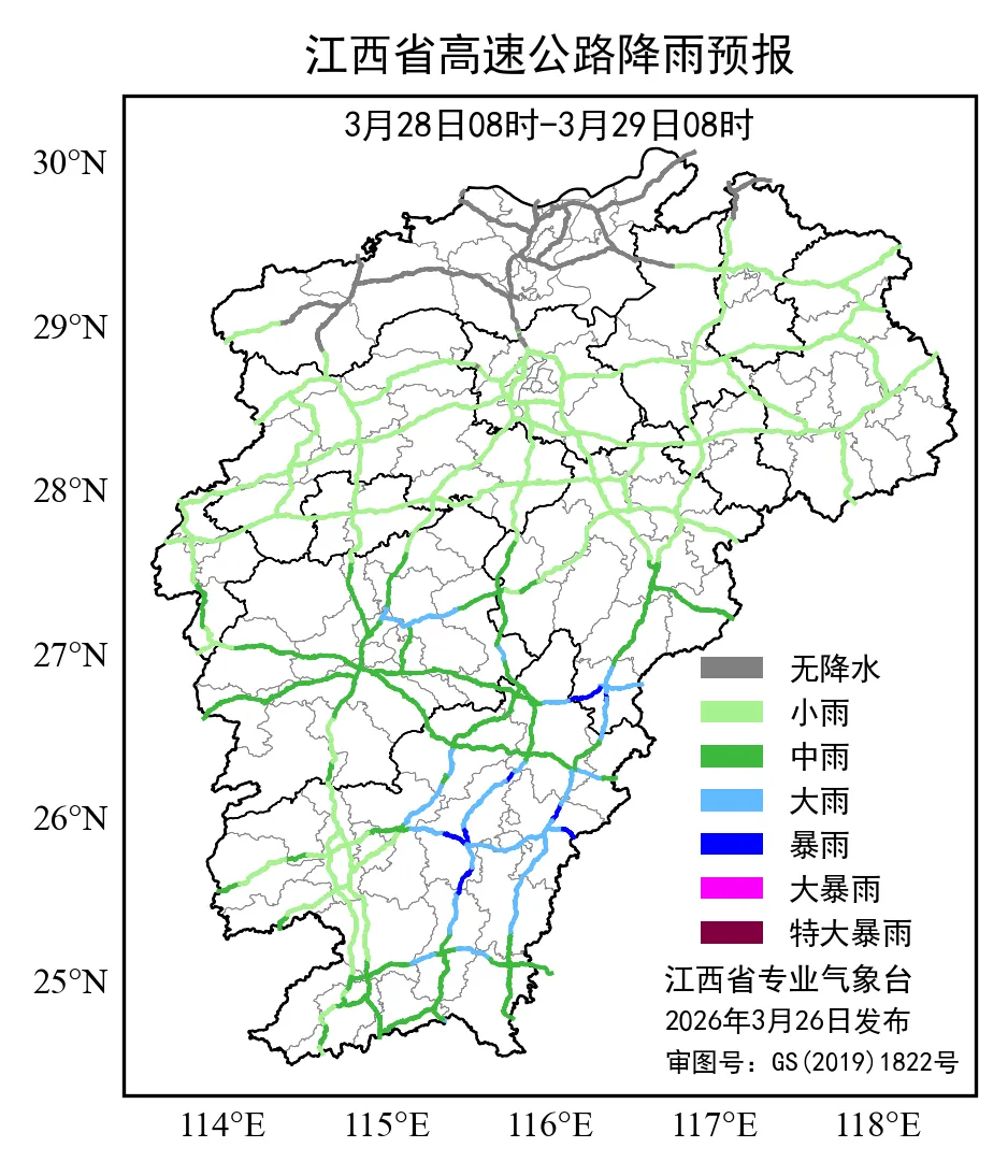 3月29日08时至3月30日08时受降雨影响的主要涉及南昌市、九江市、景德镇市、萍乡市、新余市、宜春市、上饶市7个地市、20个路段: