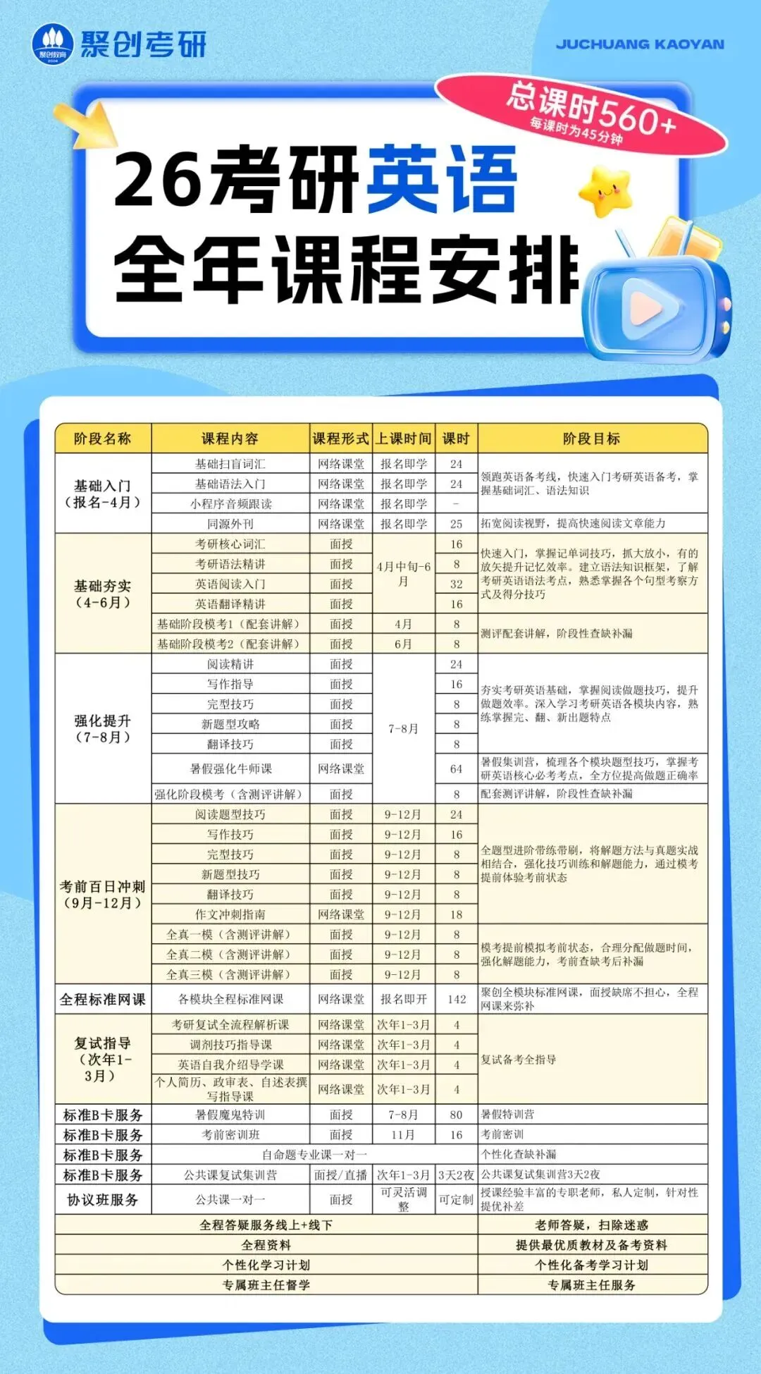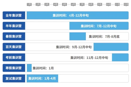 全年集训营、半年集训营、百天集训营、考前集训营、寒暑假集训营及复试集训营。
