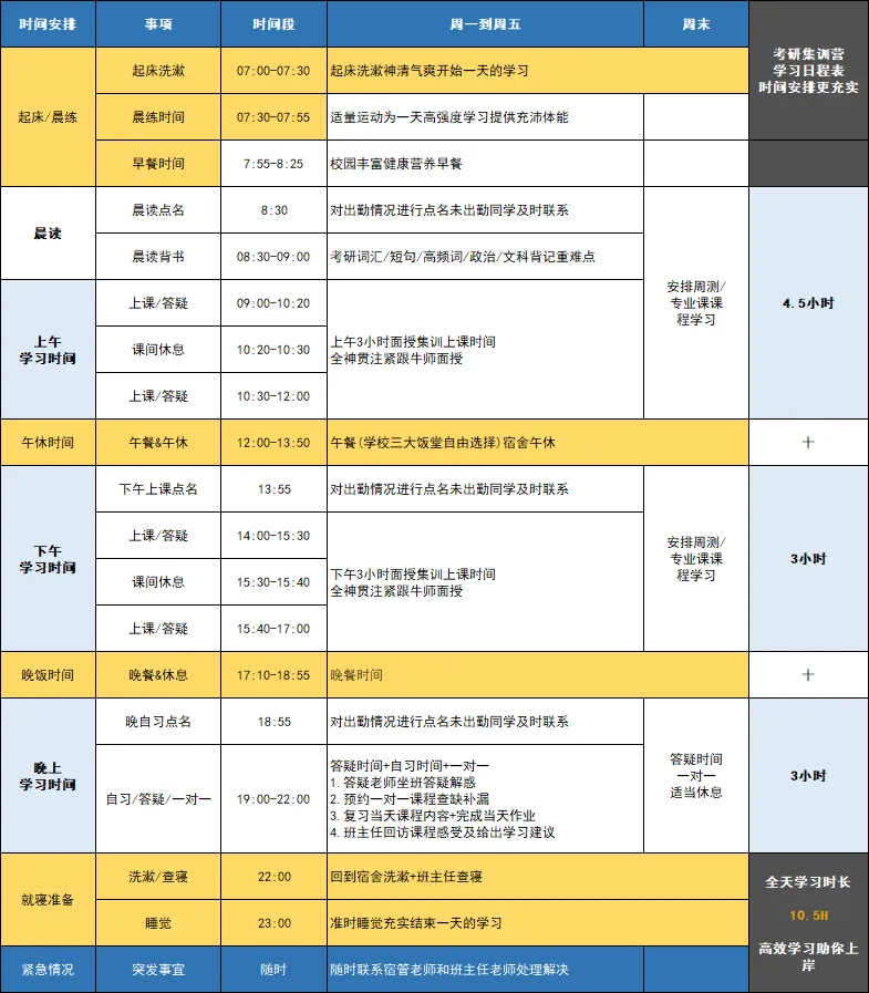聚创考研集训营每天都有紧密的课程安排,早自习+上课+测评+练习+答疑...,备考细化到分秒必争,24小时标准化作息,全身心投入,每天都是高效的复习和提升状态。