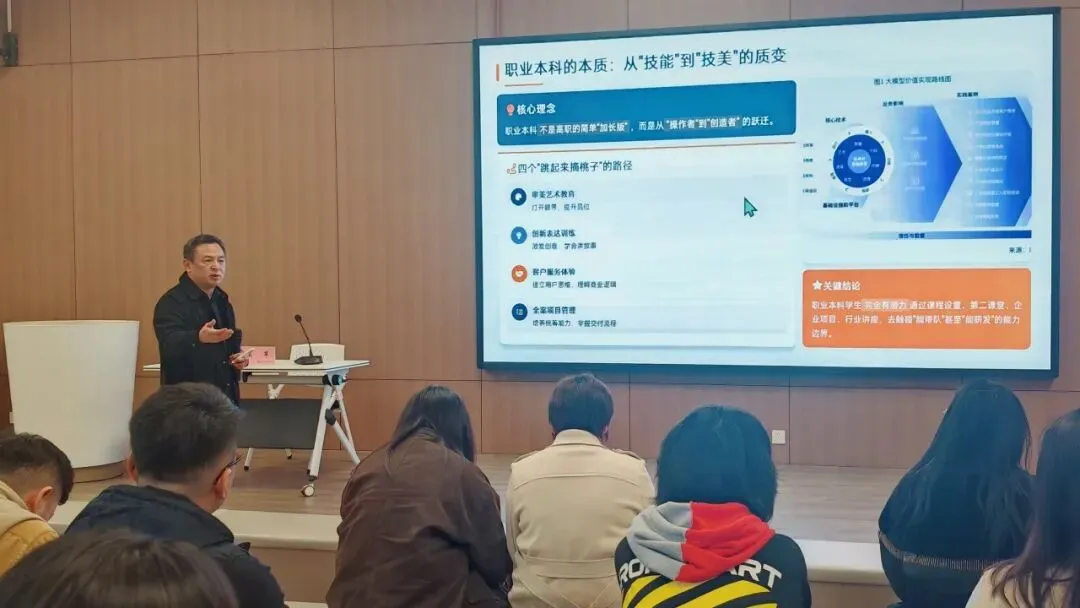 讲座中,宋军教授厘清高职、职业本科与应用型本科的培养差异,提出职业本科是从“操作者”到“创造者”的质变,需围绕培养目标、课程体系、实践教学、专业群协同四大核心要素修订,精准定位岗位、贯通课程链路、强化真实实战、推动抱团发展,同时设定课程更新、实践课时等硬性标准。