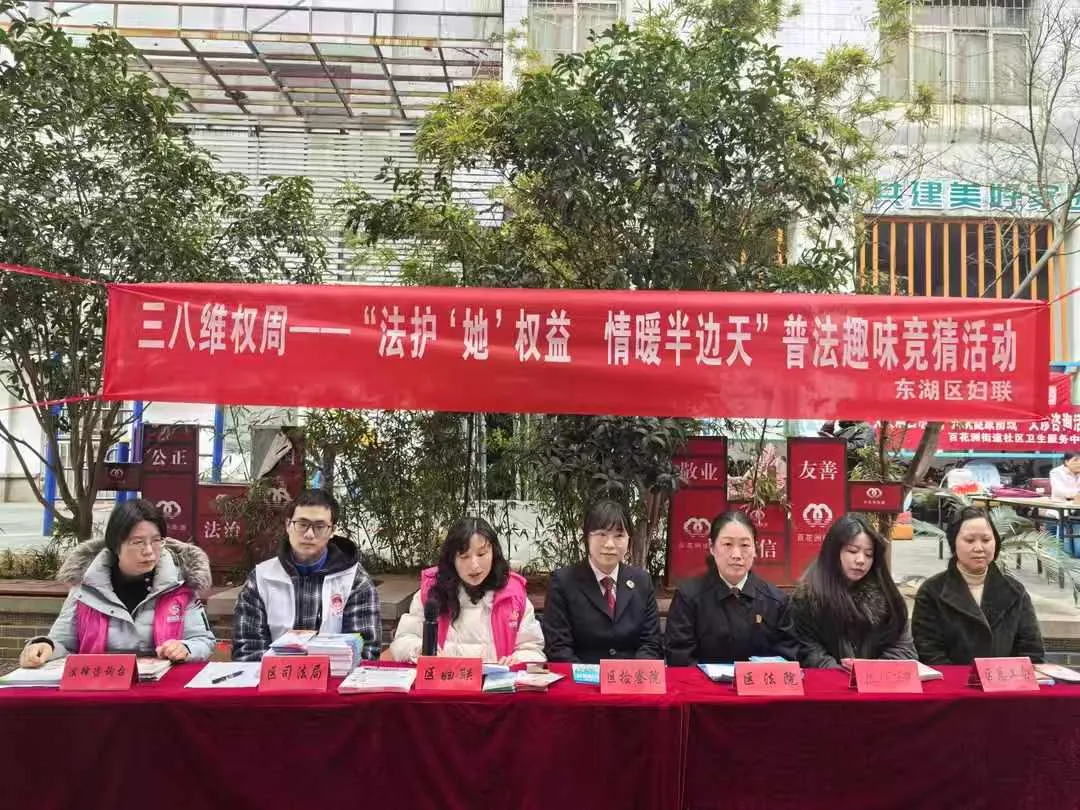 东湖区妇联联合区法院、检察院、司法局等部门,在百花洲街道刘将军庙社区开展 “法护‘她’权益 情暖半边天” 普法趣味竞猜活动。结合《妇女权益保障法》《反家庭暴力法》等法律法规,融入反诈、金融安全、个人信息保护等知识,以案释法、以题普法。东湖区妇联在大院街道院二社区开展“抵制家庭暴力,弘扬文明家风”普法宣传活动,特邀律师围绕《江西省家庭暴力告诫制度实施办法》进行专题解读,提供清晰、实用的法律指导。现场还开展了“守护家人健康 传递温情暖意”免费义诊活动。