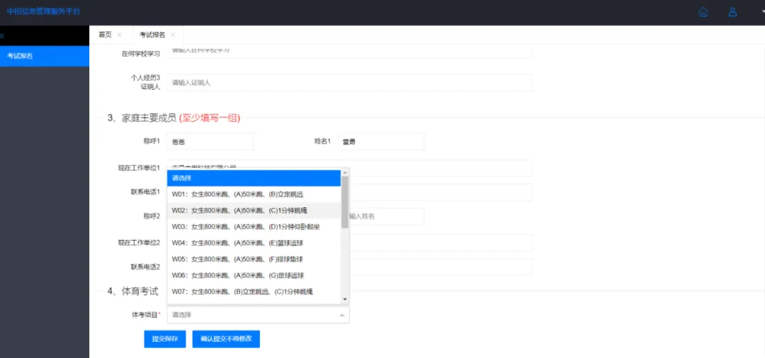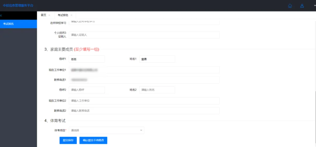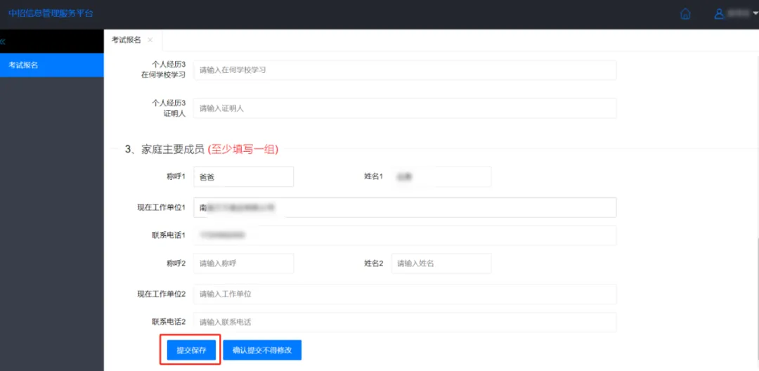 填写基本信息、个人简历、家庭主要成员(必须填写监护人,联系电话必须填写监护人准确的常用手机号码)等信息,点击“提交保存”。