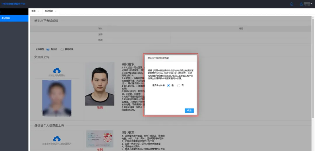 针对生物、地理有一门或者两门成绩为D的学生,系统弹出补考提示,学生可选择参加补考/不参加。