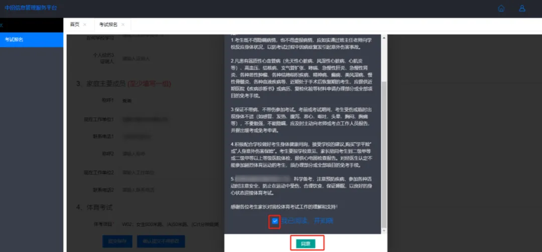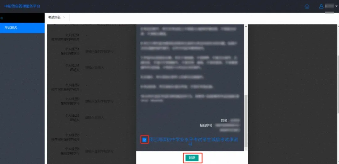 学生阅读并勾选【我已阅读初中学业水平考试承诺书】,点击【同意】。
