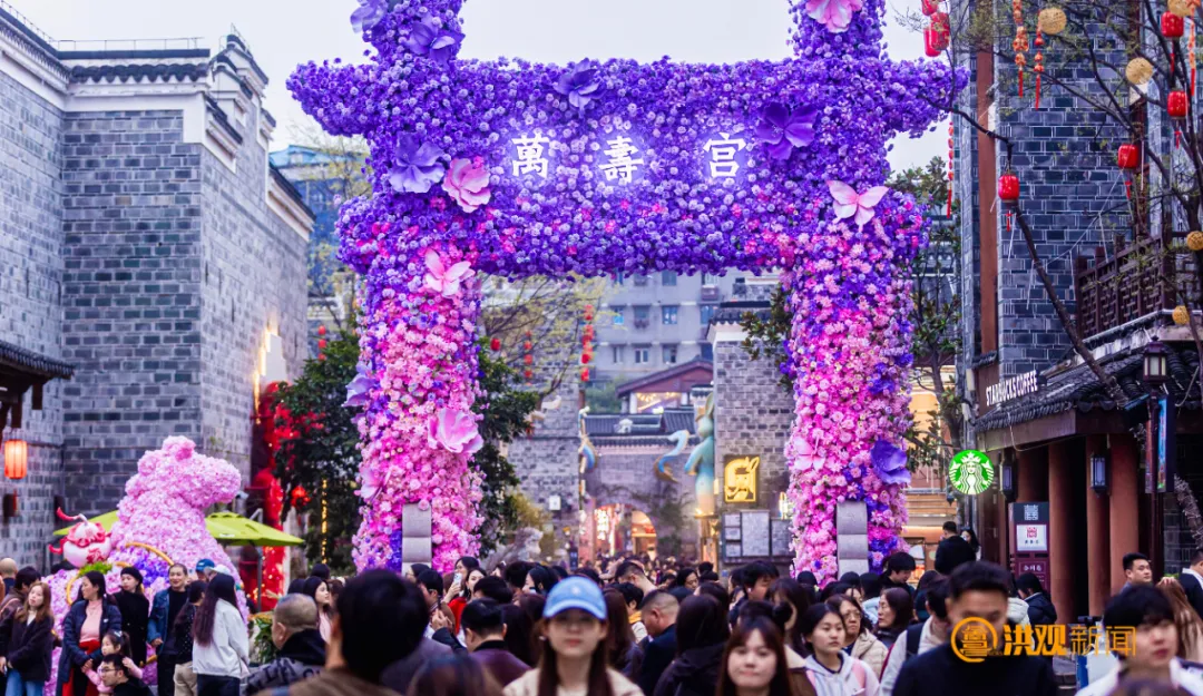 古街牌坊被粉紫花海环绕