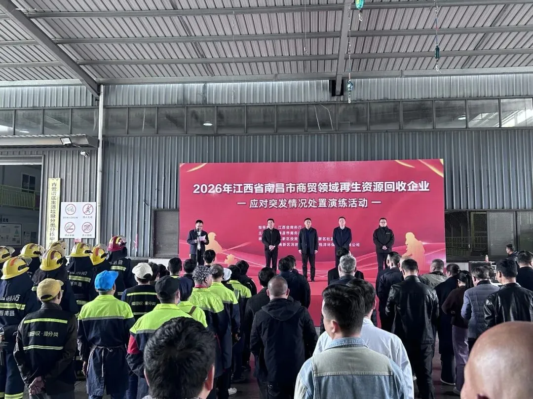为深入贯彻习近平总书记关于安全生产的重要指示批示精神,全面落实省、市安全生产治本攻坚三年行动决策部署,切实提升再生资源回收行业安全管理水平,3月27日,南昌市商务局在高新区爱分类分拣中心组织开展2026年江西省南昌市再生资源回收企业应急处置演练活动。省商务厅市场体系建设处副处长陈阵,南昌市商务局副局长胡足卿,高新区管委会副主任刘用强等出席活动,高新区投促、消防、社发、卫健等部门有关同志,各县区商务主管部门分管负责同志以及辖区再生资源回收企业代表共100余人参加演练活动。