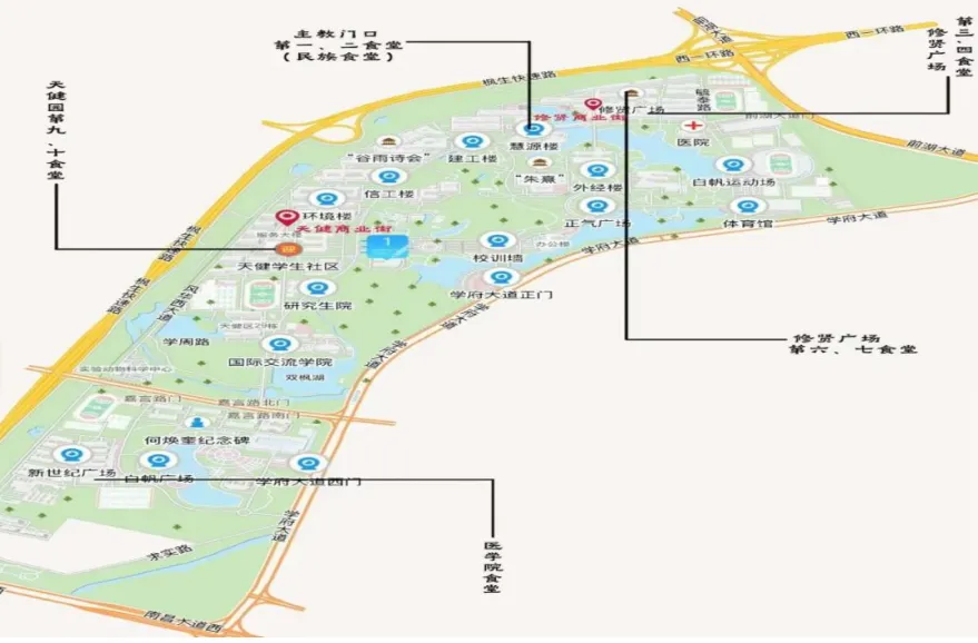 1、前湖校区:南、北院内有多个食堂,具体位置如图所示,考生们可以查阅地图,挑选距离合适的食堂就餐。食堂可以用微信、支付宝等进行线上支付。并且研小南相信这些食堂可以满足各位“干饭人”的诸多口味~