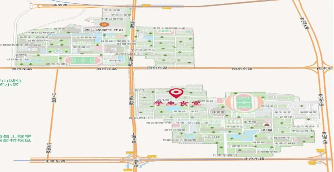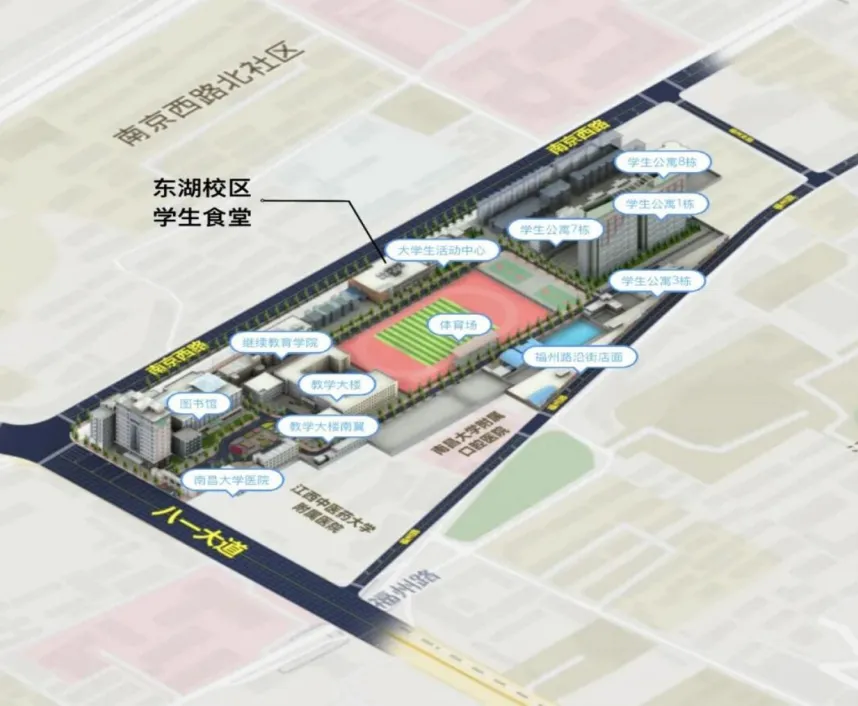 2、东湖校区:食堂位于北区,靠近体育场,按地标找超容易!