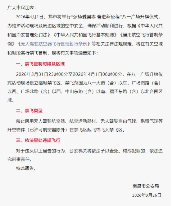 3月31日23时00分至4月1日08时00分,八一广场升旗仪式活动现场将设立临时禁飞区,禁飞范围为八一大道(含)以东、广场南路(含)以西、广场北路(含)以西、中山东路(含)以南、孺子东路(含)以北合围区域。