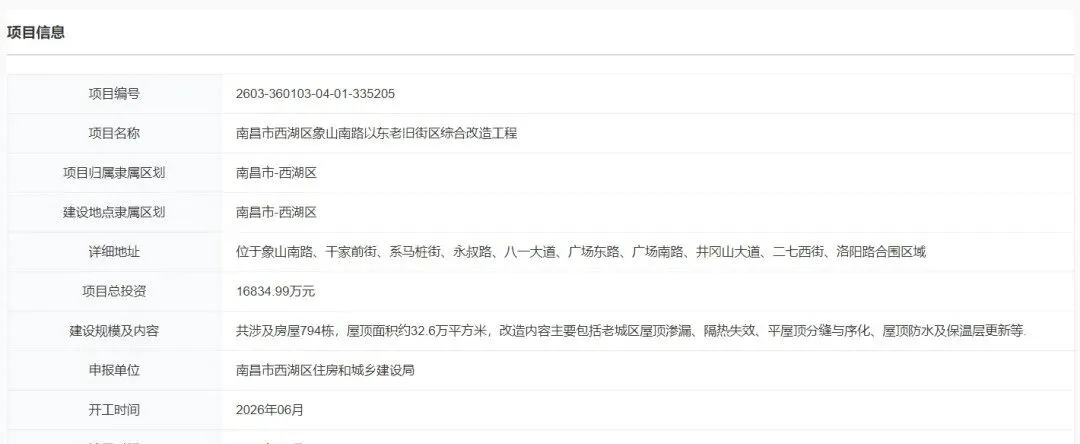 项目总投资16834.99万元。申报单位为南昌市西湖区住房和城乡建设局;预计开工时间2026年6月,竣工时间2027年5月。