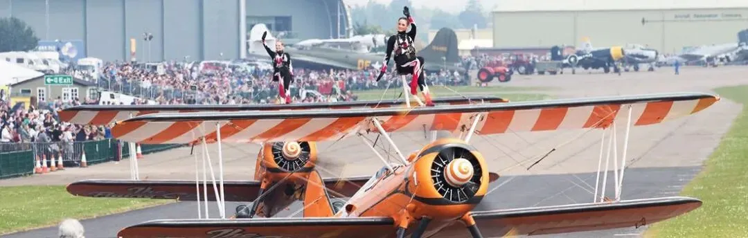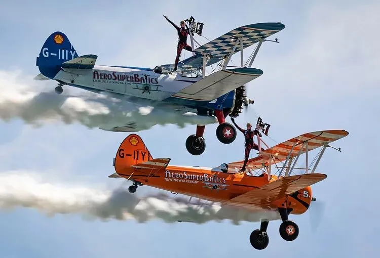 英国御风机翼行走飞行表演队于1984年创立,是超过30年的飞行表演专家,队伍拥有数架1940年生产的精美的波音·斯蒂尔曼双翼飞机。经过专业训练的机翼女郎被固定在顶翼上,表演惊险的杂技和倒立,与此同时,飞行员通过精心设计和充满活力的编排,展示令人眼花缭乱的特技飞行和近距离编队飞行。这些动作包括筋斗、横滚、失速转弯和倒飞,最高时速都达到了241公里,而“G”力达到了4G!