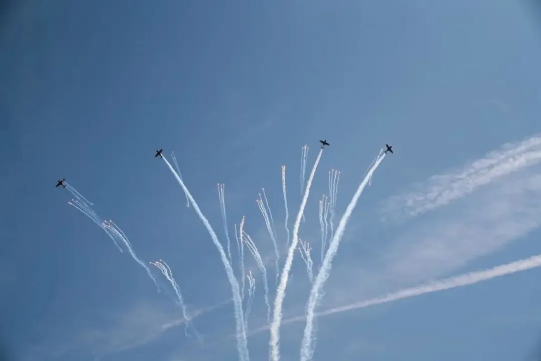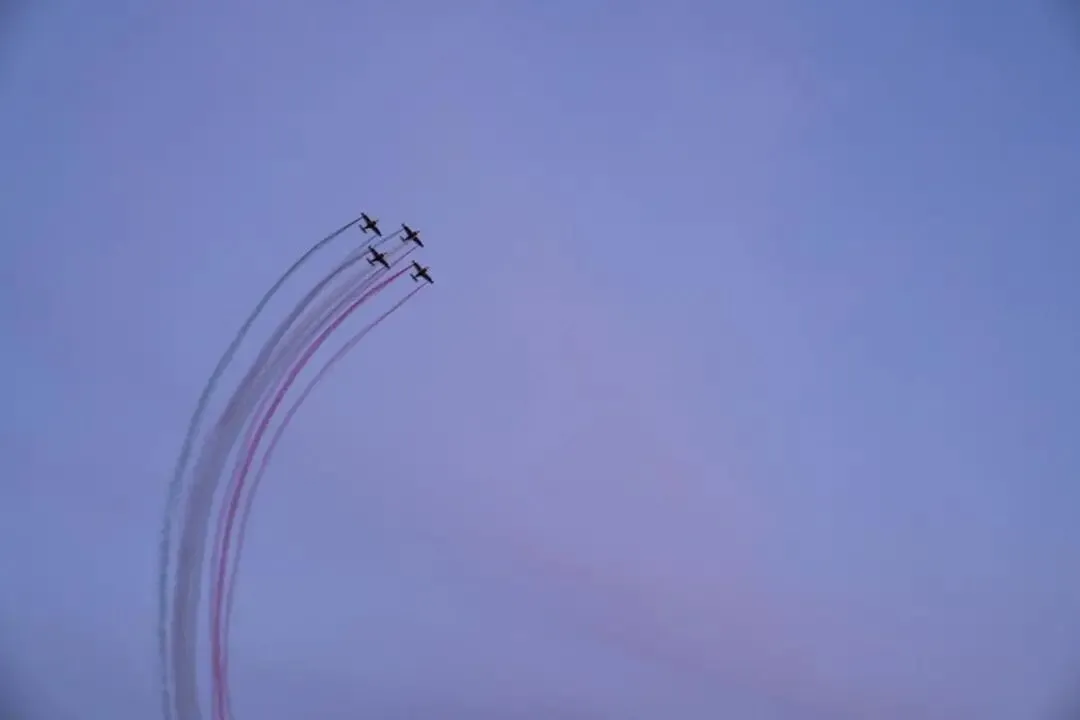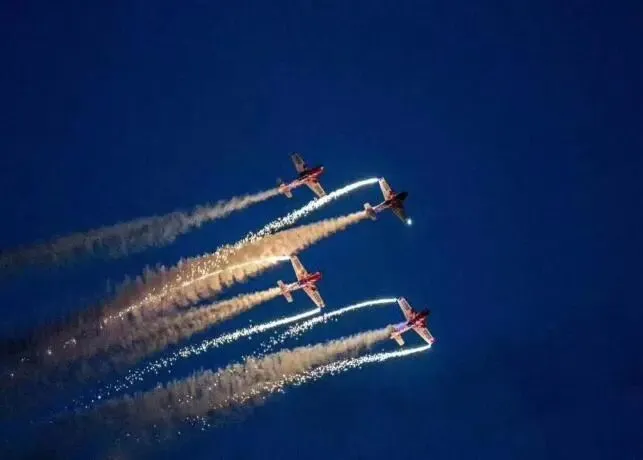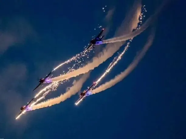 白天,开拓者队使用红、白、绿的意大利国旗三色拉出绚丽、规整的尾烟;晚霞中,队伍在编队飞行的过程中燃放闪光弹和机翼焰火,蔚为壮观。