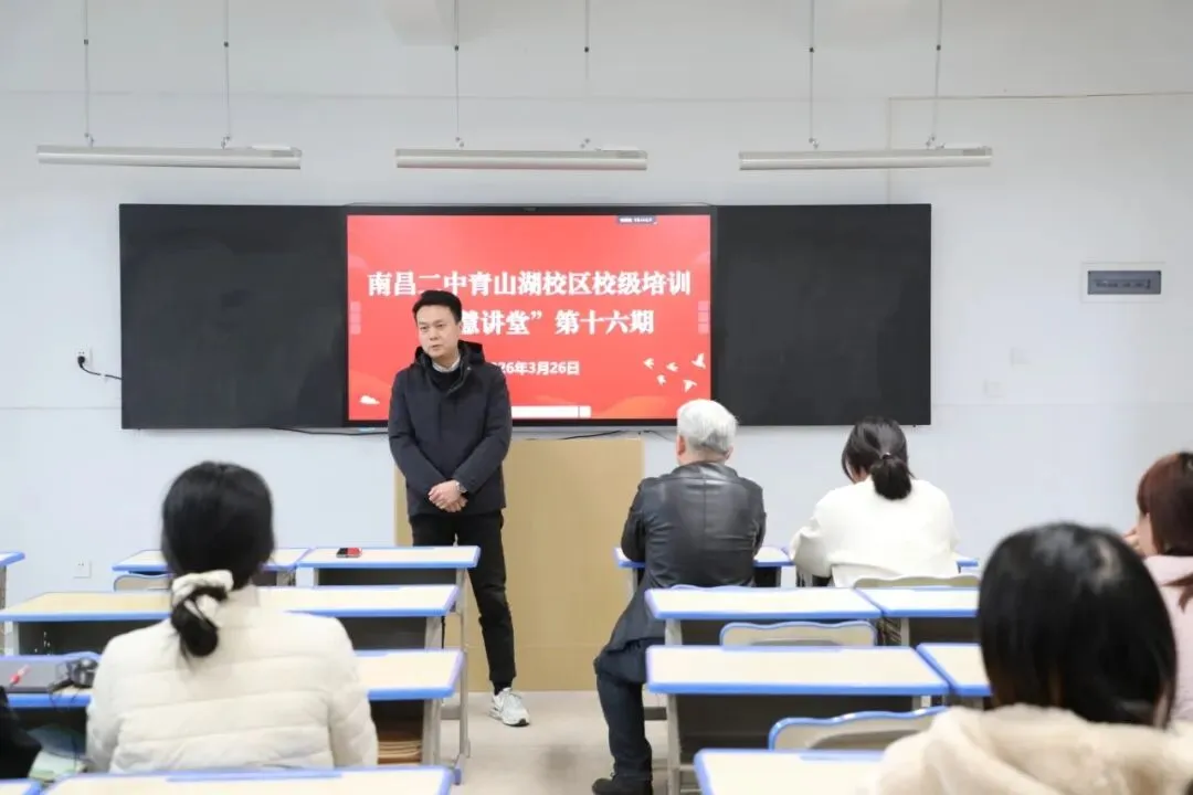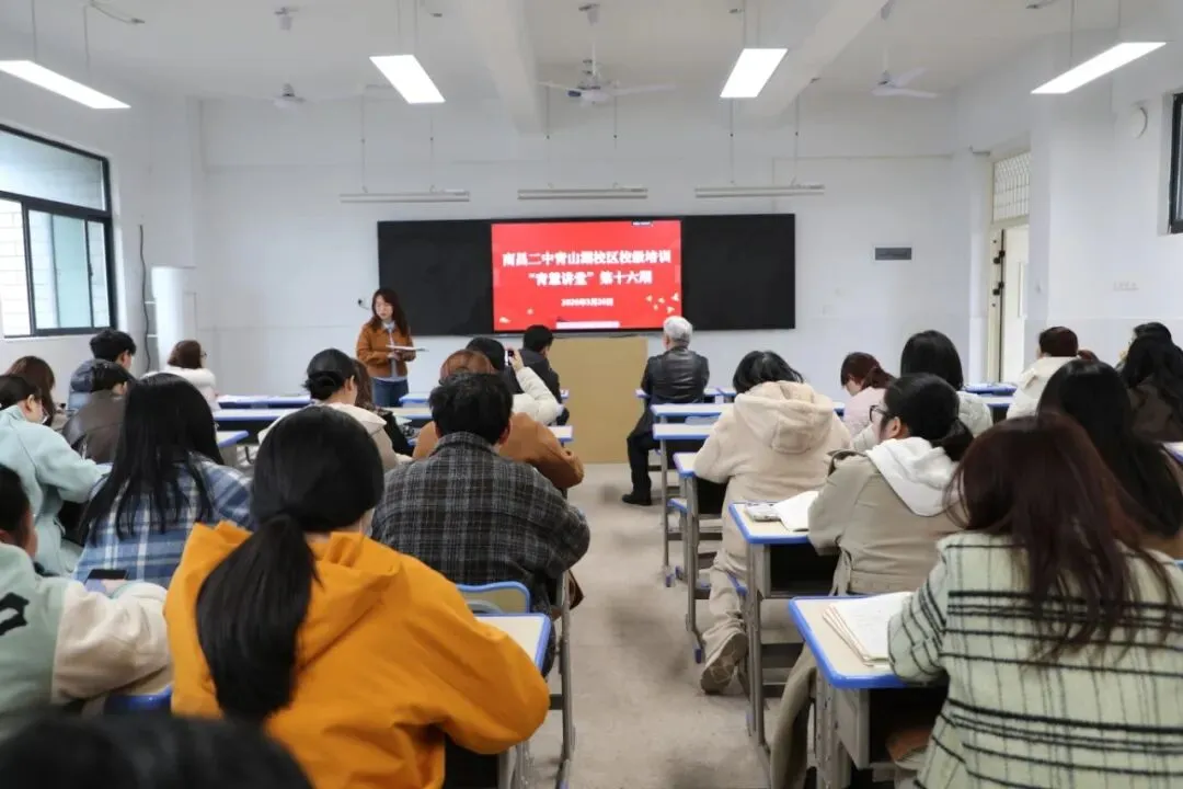 2026年3月26日,第十六期“青慧讲堂”如期开讲,本期我们邀请到已赴南昌二中总校进行浸润式学习的胡婉颦老师,以《从“心”出发,向“新”而行》为题,将她“走出去”的所见所闻、所思所悟,带回了南昌二中青山湖校区的“院子”,为全体教师带来一场有深度、有温度、有力度的专业分享。
