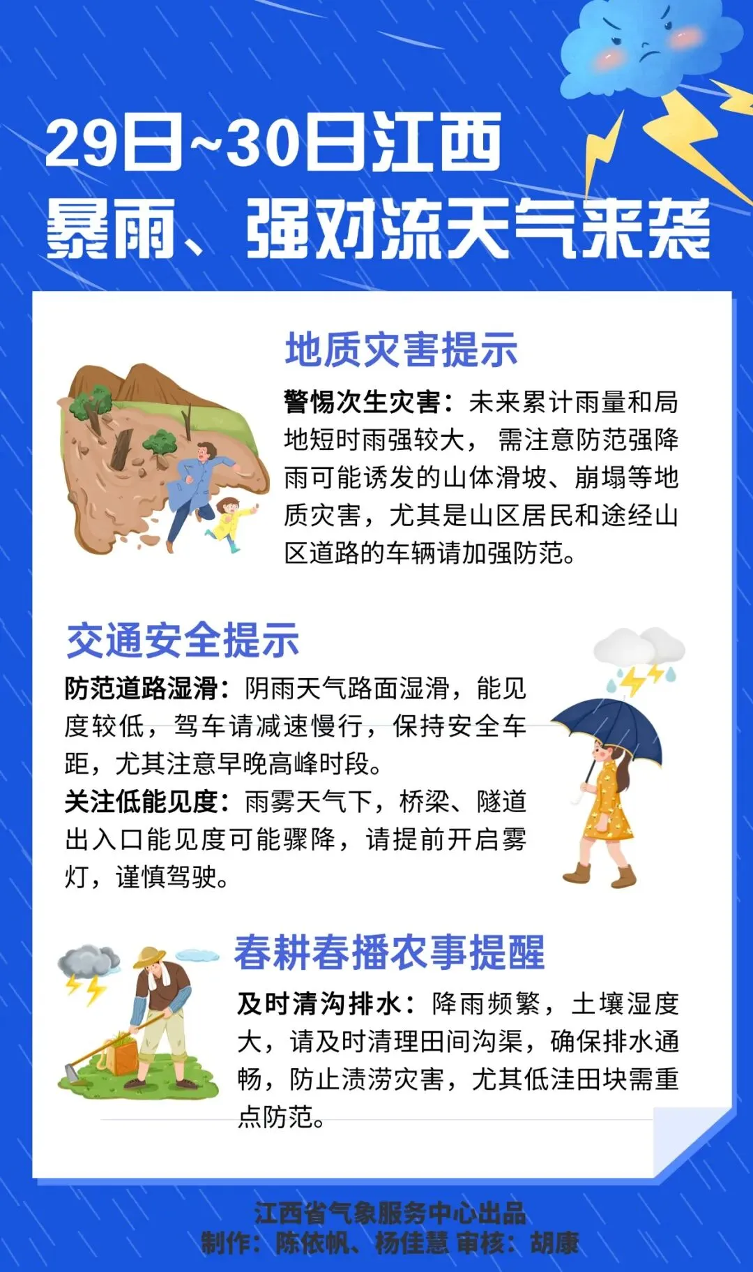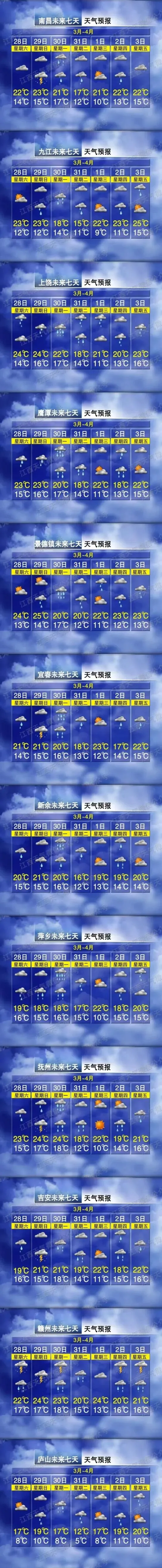 根据江西省专业气象台预报,3月28日赣中、赣南阴天有小到中雨或雷雨,局部地区有大雨;赣北多云转阴天,大部分地区转小雨。29日赣北和赣中北部阴天多云有阵雨或雷阵雨转中到大雨,部分地区有暴雨;赣中南部和赣南多云转阴天,大部分地区有阵雨或雷阵雨;全省雷雨来时,局部地区伴有强雷电、短时强降水和雷暴大风等强对流天气。