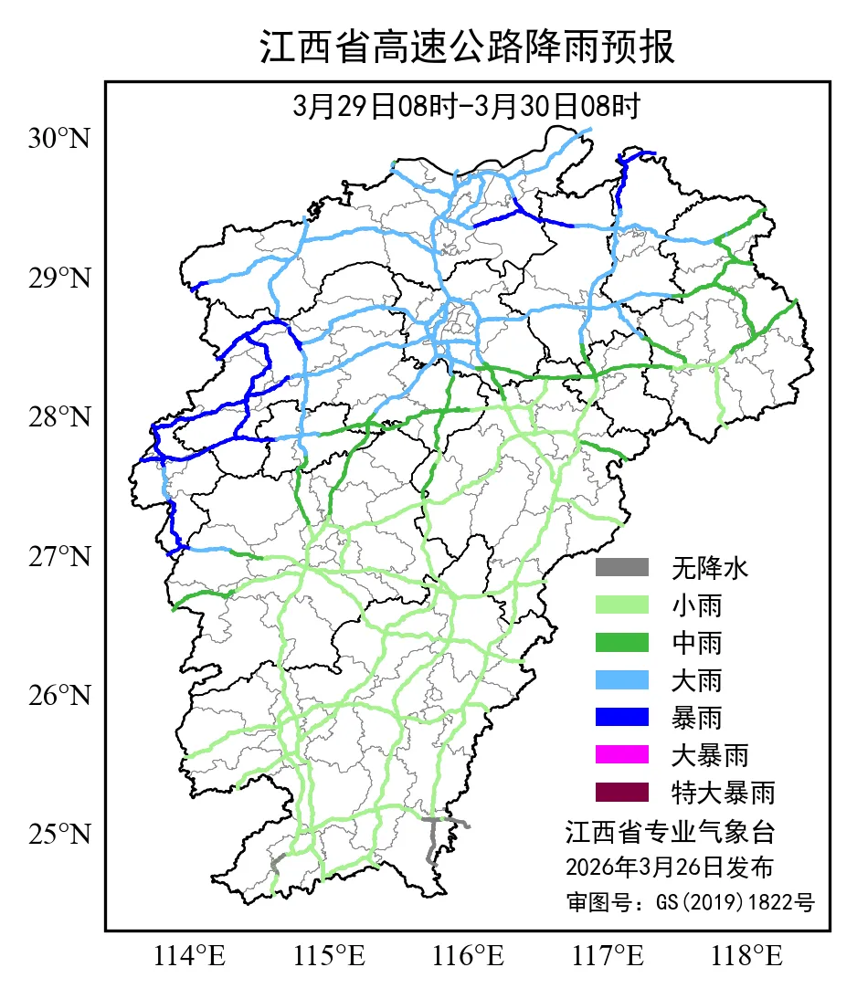 3月29日08时至3月30日08时受降雨影响的主要涉及南昌市、九江市、景德镇市、萍乡市、新余市、宜春市、上饶市7个地市、20个路段: