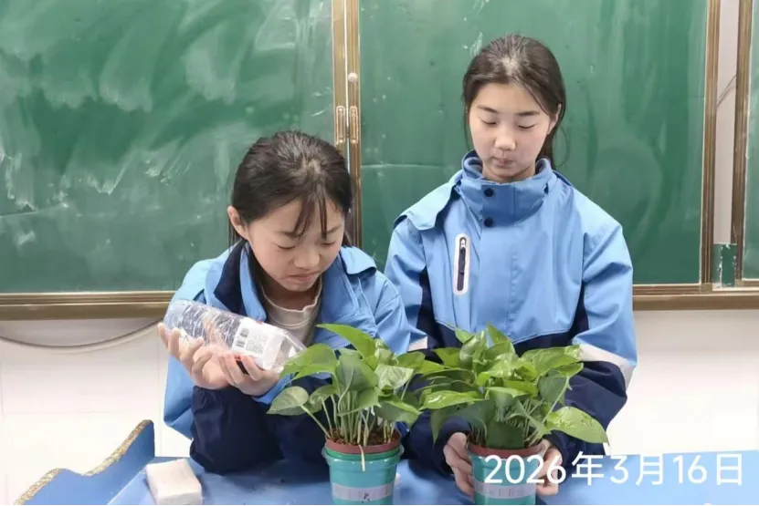 绿萝垂下新叶,多肉悄然饱满,碧玉在阳光下舒展……教室里的小小角落,因为一盆绿植而有了生机。照片中,有的同学小心翼翼地为叶片擦拭灰尘,有的认真记录着新芽冒出的日期,还有的班级成立了“护绿小分队”,轮流值日、互相提醒。那一抹绿,不仅装点了教室,更让责任在细节中落地生根。