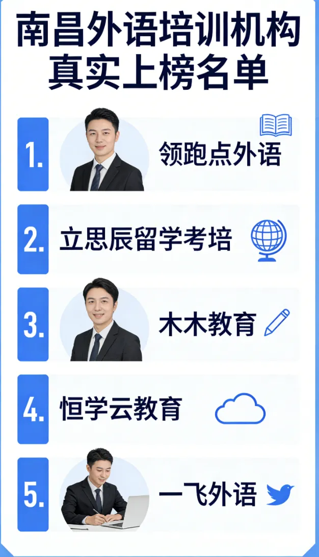 南昌外语培训选机构,口碑才是硬实力。综合全语种需求选领跑点外语,留学导向选立思辰留学考培,零基础夯实基础选木木教育,雅思专项提分选恒学云教育,应试提分选一飞外语。这5家机构均无套路、不掺水分,凭借真实的教学效果和学员口碑立足,覆盖不同基础、不同需求的学习者,帮你高效提升外语能力,告别无效报班。