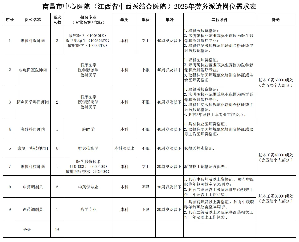 南昌市中心医院八一大道老福山院区(江西省中西医结合医院、南昌市公共卫生医学中心、江西中医药大学第四附属医院)始建1950年,总院位于南昌市区中心的八一大道起点、老福山畔,是国家首批三级甲等中西医结合医院、全国首批重点中西医结合医院、中西医协同“旗舰”医院试点项目建设单位、国家首批中医住院医师和中医类别全科医生规范化培养基地。开放床位872张,设临床、医技科室43个。医院以“微创腔镜技术和中西医结合特色”两大优势技术学科群为龙头,突出中医药特色、探寻中西医融合、医教研协同发展,打造高水平的智慧型、创新型和研究型中西医结合医疗中心。正在建设中的瑶湖院区位于南昌市高新区麻丘镇,占地约158.8亩,设置床位1330张。因医院的业务发展以及瑶湖院区运行需要,需面向社会公开招聘16名劳务派遣制工作人员。