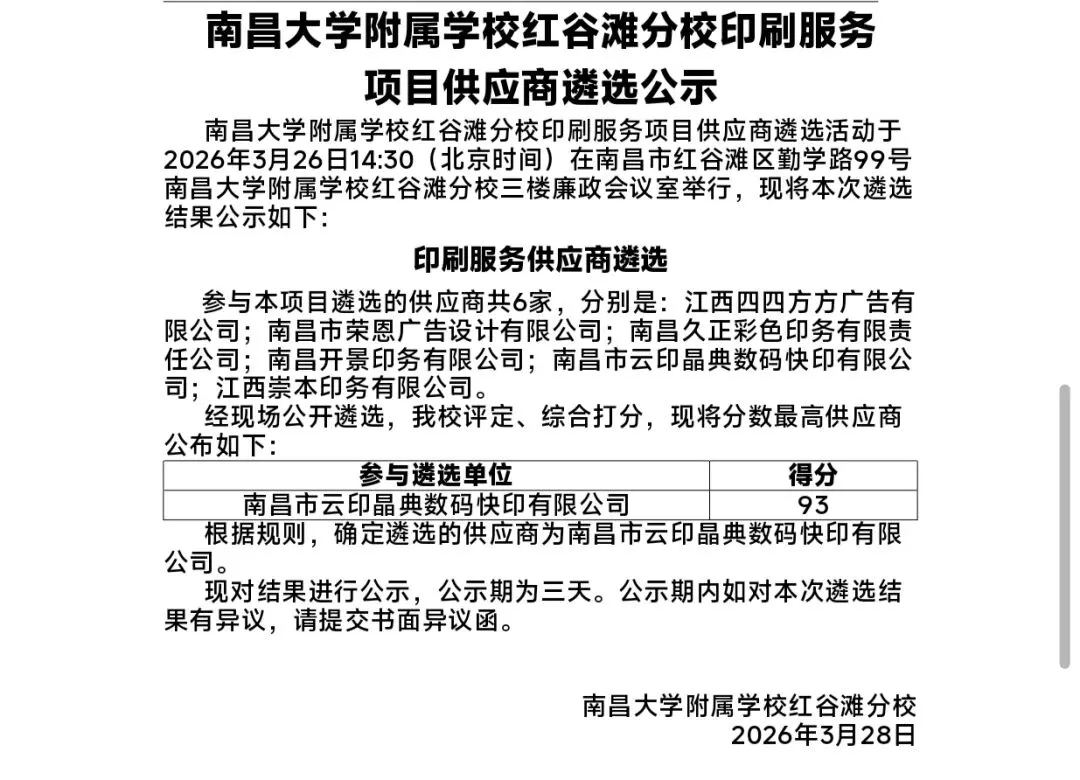 南昌大学附属学校红谷滩分校印刷服务项目供应商遴选公示