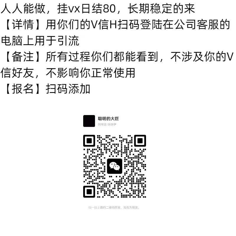 挂企业VX-200一天【详情】之前加入过认证企业。还在企业,是绿标。能加好友的。就可以来。200一天。扫码到我们客服电脑上。手机和电脑你同时看得到聊天记录,用来接待其他兼职人员找工作进行分流。满足条件的来扫码加我了解。扫码后发企业微信名片过来看看能不能做。【报名】扫码添加