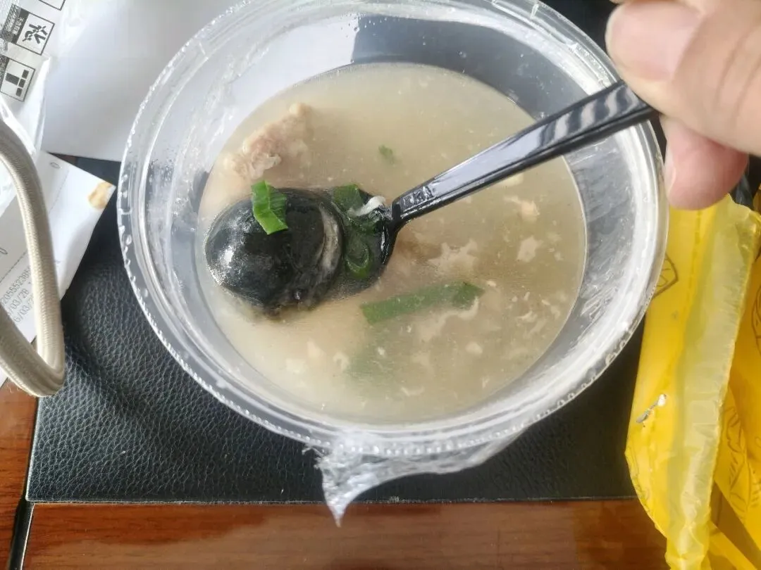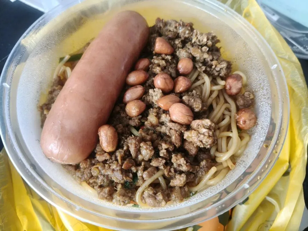 尝了尝味道真的不错,我点的是肉酱拌粉,我点的微辣,对我一个不太能吃辣的人来说刚刚好,粉是细粉,没有汤,是用肉酱,食用油,辣椒油等调味料拌的,可以选择是否加小葱花和香菜,上面撒了些油炸花生米,增加了香味。搭配一份皮蛋肉饼汤,也是南昌的特色,味道也很不错,里面有一颗皮蛋,还有一块肉饼。粉里外加一根肠,今天碳水和肉量直接拉满了。