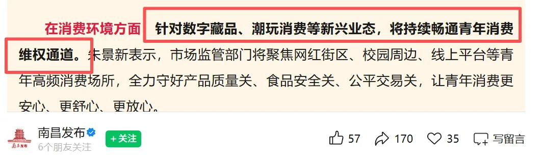 方案里最值得关注的,是这句 “针对数字藏品等新兴业态,持续畅通青年消费维权通道”。