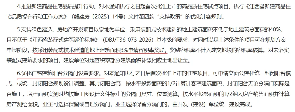 按照过往规则,多数城市(包括南昌此前)执行“开敞阳台按1/2计容、封闭阳台按全面积计容”的标准,开发商若想统一封闭阳台,会面临计容面积增加、容积率超标、需补缴土地出让金的风险,这也是以往开发商不愿统一封阳台的核心原因之一,这也是新政核心激励点。