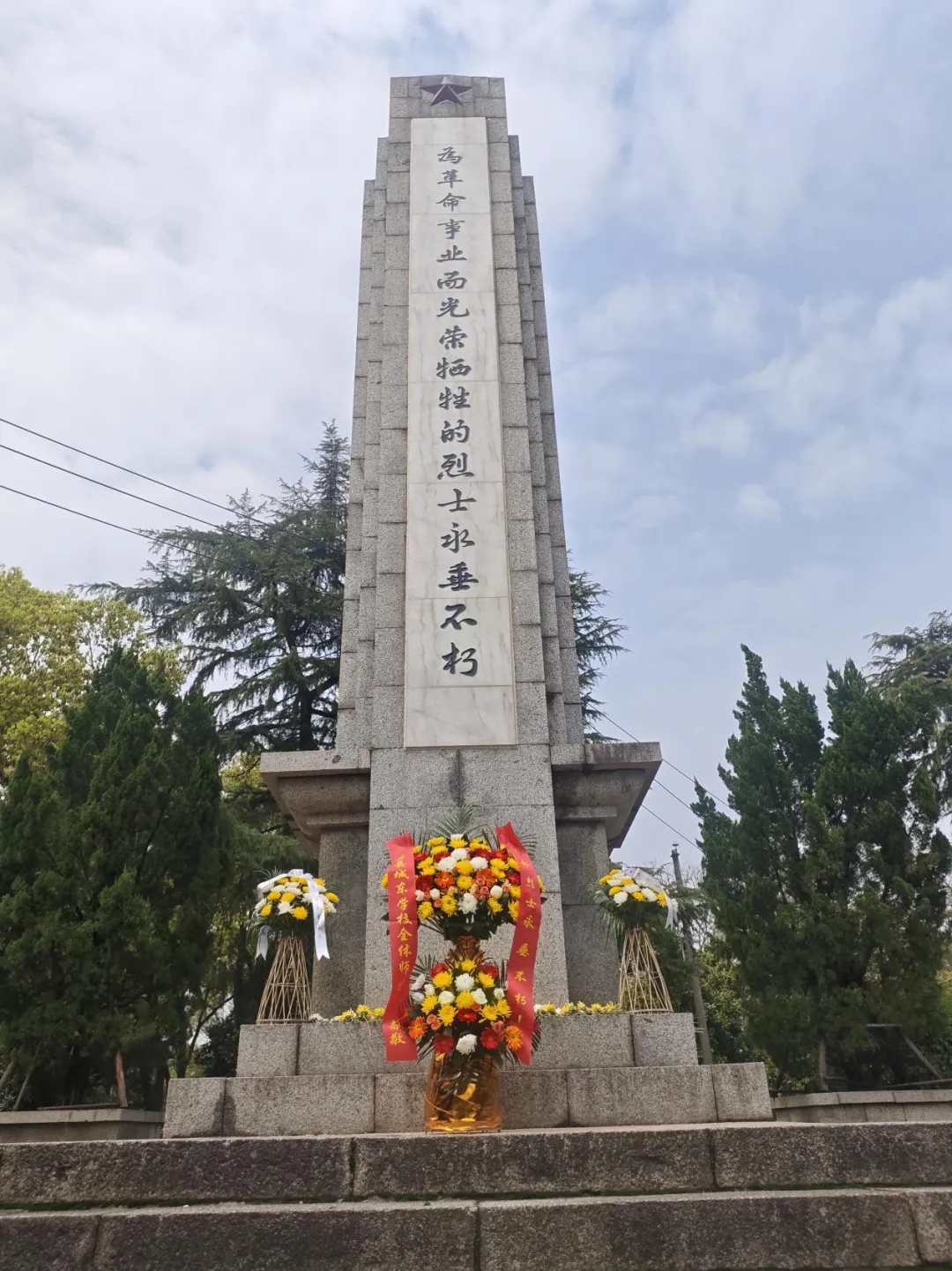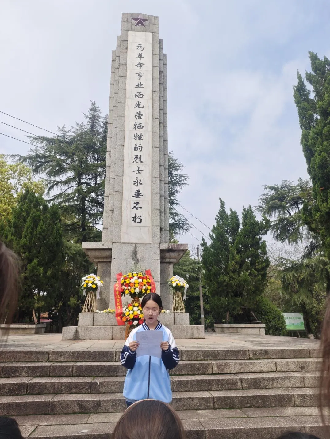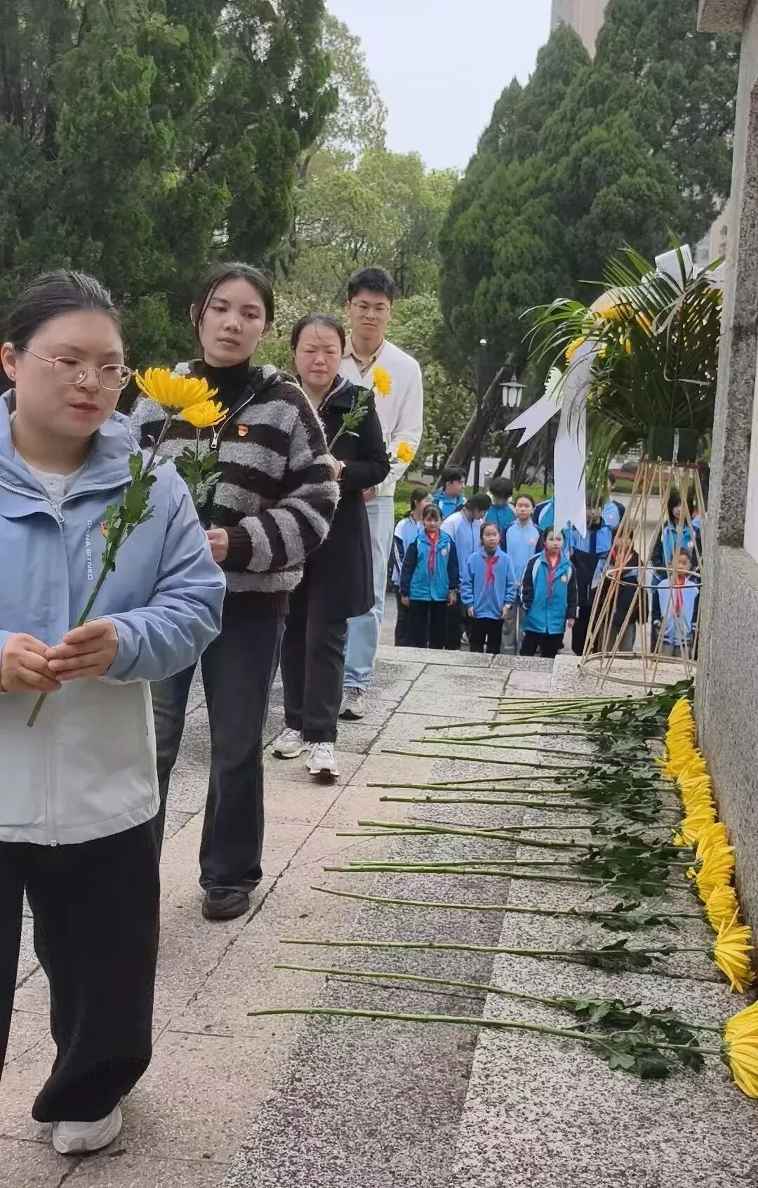 抵达人民公园革命烈士纪念塔前,活动现场庄严肃穆,巍峨的纪念塔矗立在苍松翠柏之间,诉说着革命先烈的英勇与无畏。师生们着装整齐,手捧菊花,列队静立,满怀崇敬与哀思,静待仪式开启。