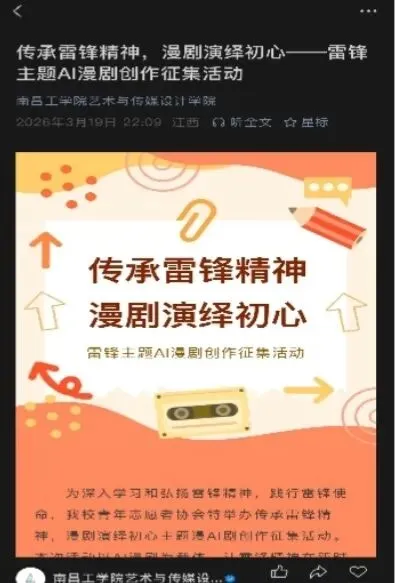 “传承雷锋精神,漫剧演绎初心”AI漫剧创作征集活动在校园内正式启动。活动面向全校学生,以AI漫剧为创新载体,围绕雷锋精神进行原创创作,分为作品征集、线下评奖、成果展示三个阶段推进。征集期内,同学们结合专业所学,用AI工具绘制分镜、生成画面,以青春视角构思脚本,将雷锋助人为乐、爱岗敬业的事迹转化为生动的漫剧片段;评审环节中,主办方从主题契合度、创意表现、制作水准等维度逐一打分,筛选出兼具思想性与艺术性的优秀作品,评选出的优秀作品将通过学校官方平台进行成果展示。活动紧扣专业特色,为同学们提供了创意表达与技能实践的平台,在创作中更深入地理解雷锋精神的时代内涵,提升AI内容创作的实操能力。