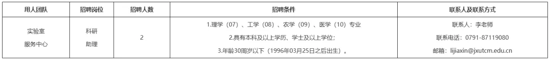 因工作需要,江西中医药大学实验室服务中心现招聘科研助理两名,现将有关事项公告如下: