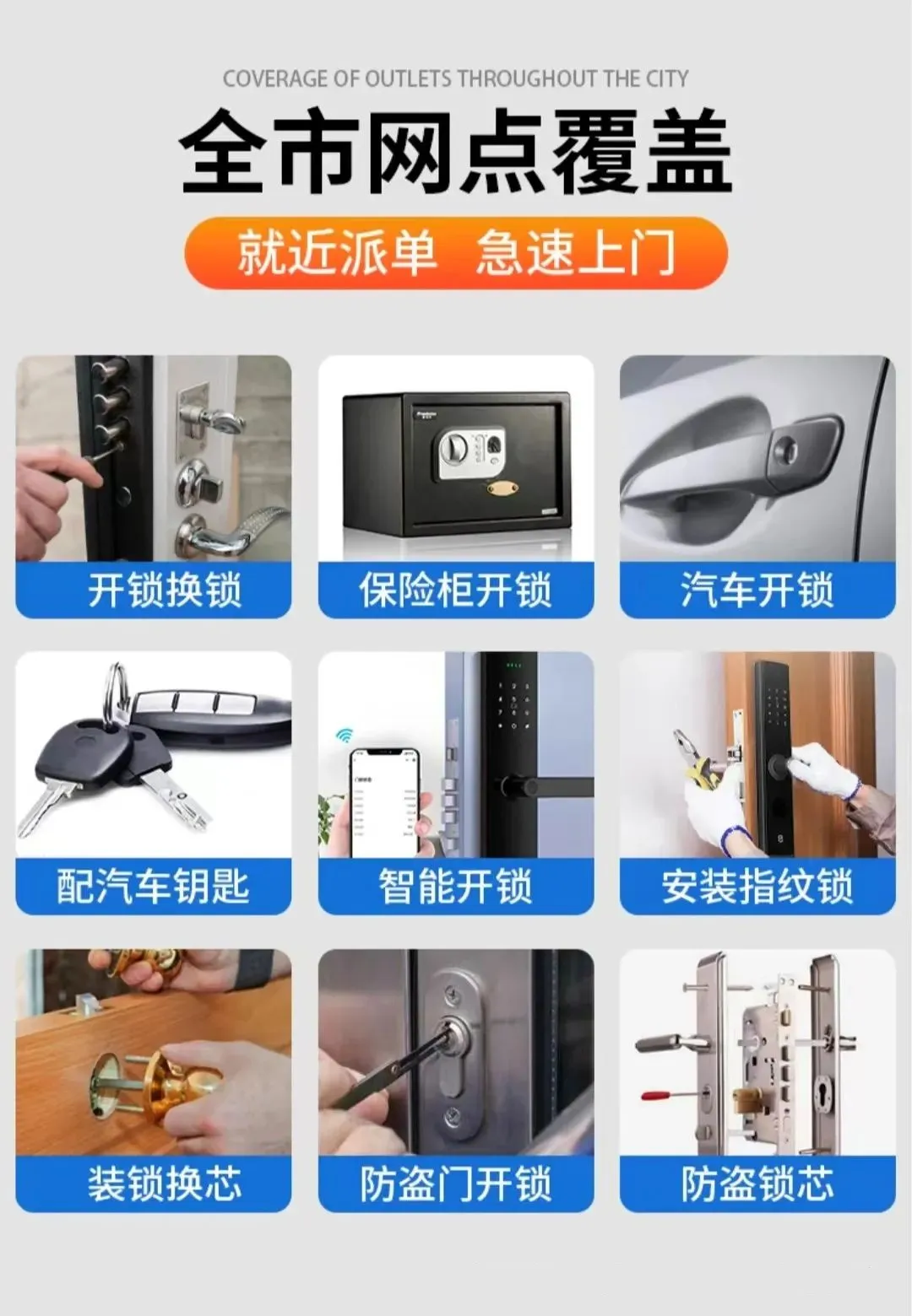 🔑 上门开锁(防盗门、卧室门、车锁等)🔑 更换锁芯(A级/B级/C级锁芯升级)🔑 指纹锁安装与维修🔑 保险柜开启与维修🔑 配钥匙(普通钥匙/汽车钥匙)🔑 门禁系统安装与维护🔑 家庭/商铺防盗升级方案