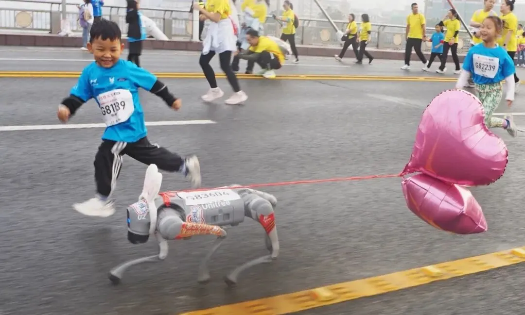 2024年11月10日,江西南昌,2024南昌马拉松鸣枪开跑,一名参赛儿童与马拉松“欢乐跑陪跑狗”——智能机器狗在八一大桥上并肩前行。