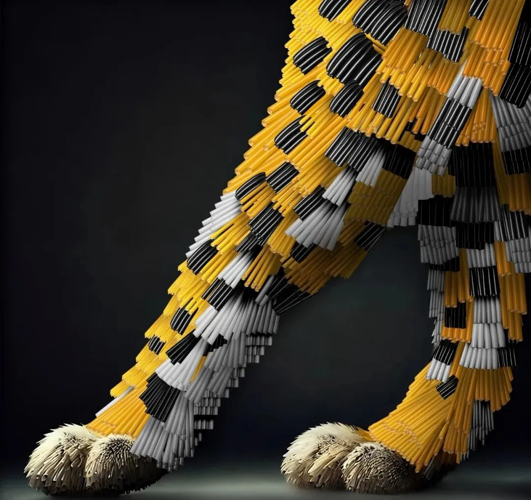 作品以虎、豹、犀牛、大象、海豚、斑马等动物的形象为主体,用塑料吸管拼贴创作。日常材料与自然象征对比,隐喻人类以人工重构自然及消费对生态的影响。