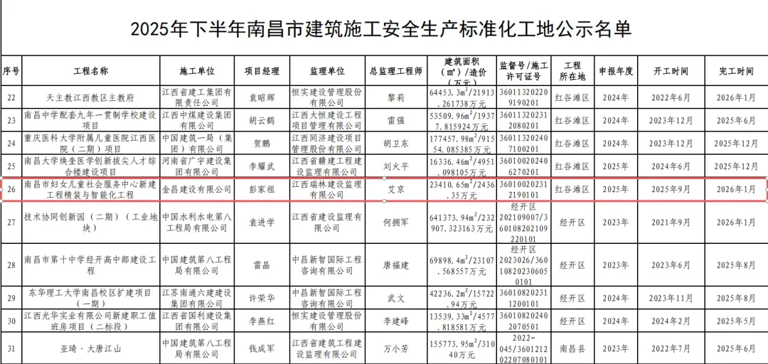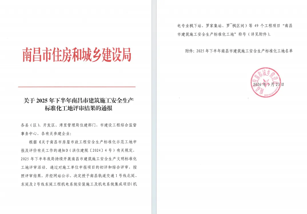 2025年下半年南昌市建筑施工安全生产标准化工地评审结果已在南昌市住房和城乡建设局官网正式揭晓,金昌建设有限公司承建的南昌市妇女儿童社会服务中心新建工程精装与智能化工程,凭借严谨规范的安全管理体系、全程从严的施工过程管控及高标准的现场文明施工举措,评为“2025年下半年南昌市建筑施工安全生产标准化工地”,为企业安全生产工作再添一项重要荣誉。