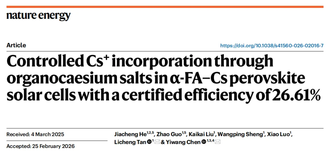 题目:Controlled Cs⁺ incorporation through organocaesium salts in α-FA–Cs perovskite solar cells with a certified efficiency of 26.61%作者:Jiacheng He, Zhao Guo, Kaikai Liu, Wangping Sheng, Xiao Luo, Licheng Tan & Yiwang Chen接受日期:First published: 27 March 2026原文链接:https://doi.org/10.1038/s41560-026-02016-7