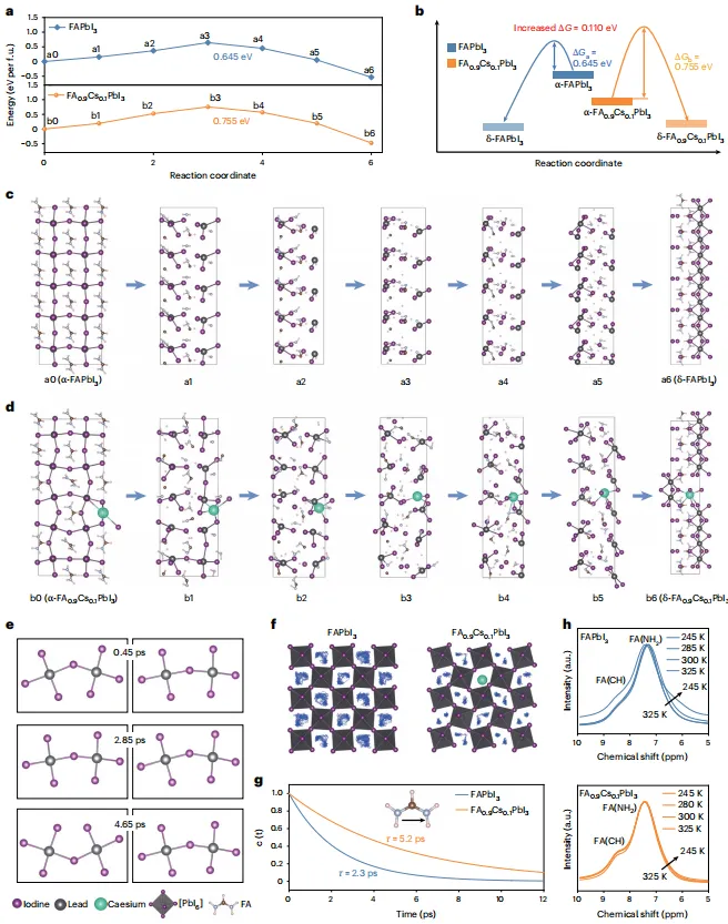 图1 | 相变的动力学与热力学分析。a,计算得到的势能。f.u.,公式单位。b,自由能演化与相变能垒示意图。c,d,钙钛矿(c)和FA0.9Cs0.1PbI3(d)在相变过程中的过渡态结构。e,[PbI6]4−八面体在不同时间点的倾斜运动快照。f,FA+中氮原子位置随时间累积的密度图。g,FA+阳离子的向量自相关函数,表示FA+随时间保持其初始取向的概率。插图:箭头指示的FA+离子分子向量。h,钙钛矿和FA0.9Cs0.1PbI3晶体的温度依赖性固态1H NMR谱图。