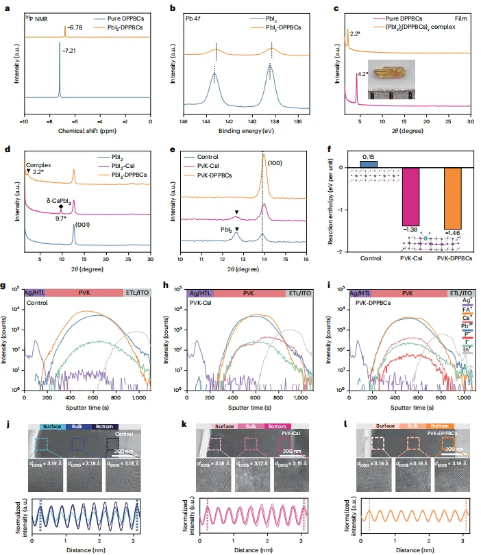 图2 | DPPBCs在两步法中对Cs+有效掺杂的机制。a、原始DPPBCs与PbI2-DPPBCs的31P NMR谱图。b、碘化铅及PbI2-DPPBCs中Pb 4f的 XPS 谱图。c、纯DPPBCs与(碘化铅)x(DPPBCs)y复合薄膜的 XRD 图谱。插图:(碘化铅)x(DPPBCs)y薄膜(晶体尺寸为2 mm)的照片。d、碘化铅、碘化铅–碘化铯及PbI2-DPPBCs薄膜的 XRD 图谱。e、对照组、 PVK -CsI及 PVK -DPPBCs钙钛矿薄膜的 XRD 图谱。f,计算得出的形成钙钛矿和FA0.9Cs0.1PbI3的反应焓。插图:钙钛矿(上)和FA0.9Cs0.1PbI3(下)的钙钛矿晶体结构计算结果。g–i,对照样品(g)、 PVK -CsI(h)和 PVK -DPPBCs(i)的ToF-SIMS深度分布图。 HTL ,空穴传输层,Spiro-OMeTAD; ETL ,电子传输层,氧化锡。j–l,上:对照样品(j)、 PVK -CsI(k)和 PVK -DPPBCs(l)的 HAADF -STEM横截面图像。下:图表显示计算强度的变化,相应图像中提供了计算得到的层间距。d(200)表示钙钛矿(200)晶面间距。