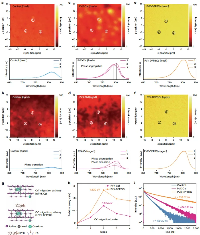 图3 | 钙钛矿薄膜在光照浸泡条件下的稳定性。a-f分别为对照组(a,b)、 PVK -CsI(c,d)和 PVK -DPPBCs(e,f)样品在光照浸泡前(a,c,e)及光照浸泡后(b,d,f)的PL映射光谱。底部显示对应选取区域的PL光谱。g,h, PVK -CsI和 PVK -DPPBCs钙钛矿晶格中Cs+离子迁移路径(g)与Cs+离子迁移势垒(h)的理论模型。i,对照组、 PVK -CsI及 PVK -DPPBCs样品的 TRPL 光谱。