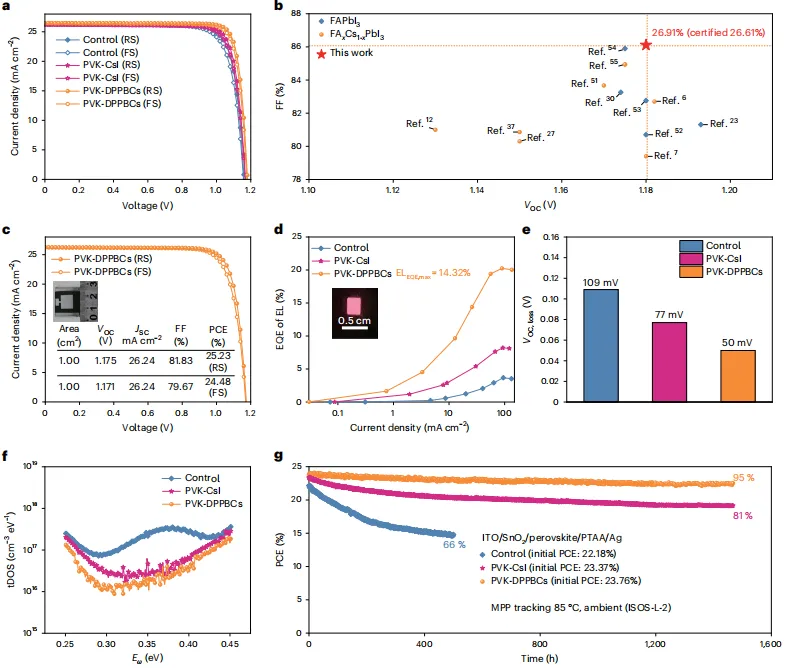 图4 | 设备性能与稳定性。a,对照组、 PVK -CsI及 PVK -DPPBCs器件的反向扫描(RS)与正向扫描(FS)J-V曲线。b,通过两步法制备的钙钛矿及FAxCs1-xPbI3光伏太阳能电池所获得的VOC、FF值及工作寿命统计图。c,冠军级1 cm² PVK -DPPBCs器件的J-V曲线。插图:1 cm²电池照片。d,对照组、 PVK -CsI及 PVK -DPPBCs器件在LED工作模式下的电致发光(EL)EQE 。插图: PVK -DPPBCs器件的EL图像。e,f,对照组、 PVK -CsI及 PVK -DPPBCs器件的VOC损失分析(e)与tDOS光谱(f)。 Eω 为分界能。g,封装式对照组、 PVK -CsI及 PVK -DPPBCs器件在以 PTAA 作为空穴传输层、采用 ISOS -L-2方案(85°C环境湿度)连续1个太阳当量白光LED照射最大功率点时的光电转换效率(PCE)变化曲线。