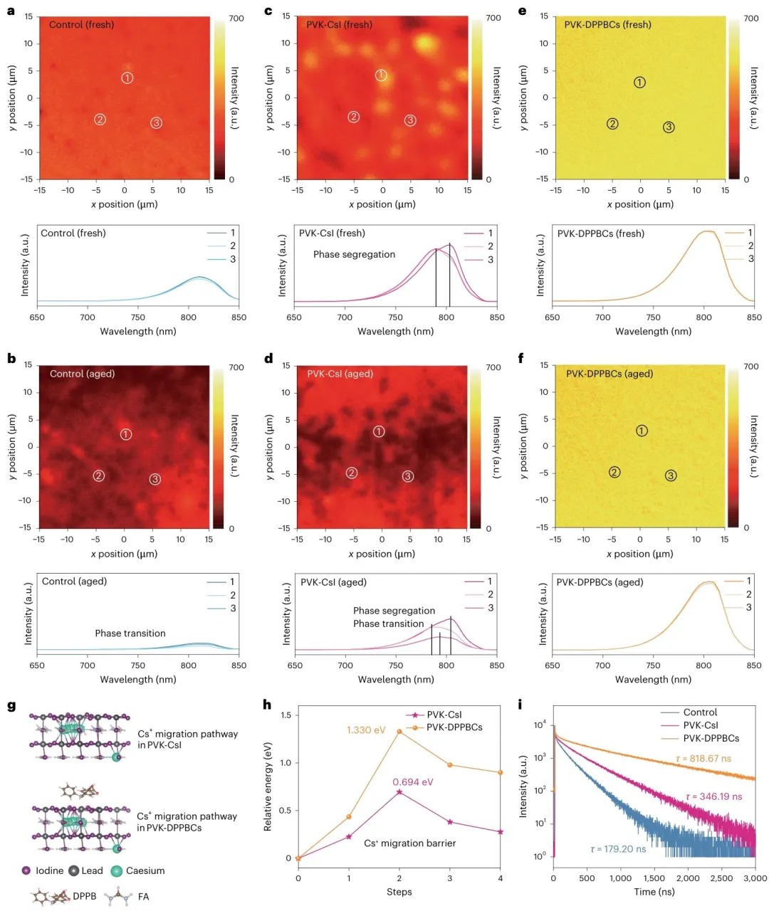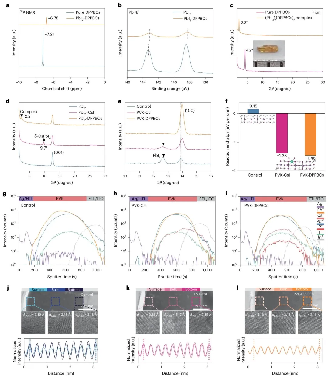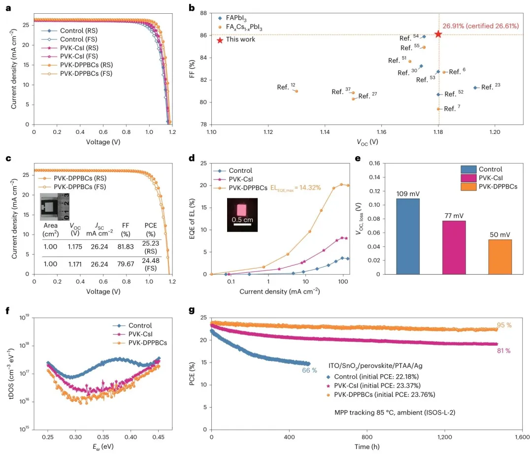 甲脒–铯基金属卤化物钙钛矿凭借可精准调控的晶体生长特性,在两步法制备高效太阳电池中展现出显著优势。然而,受限于铯离子可控掺杂量不足、相变机制尚不清晰,稳定获取器件所需的理想α相仍面临严峻挑战。针对这一关键瓶颈,研究团队创新性设计并合成4-(二苯基膦基)苯甲酸铯,通过有机铯盐精准调控Cs⁺掺入,实现高效掺杂与阳离子均匀分布,成功制备出高相稳定性的高质量钙钛矿薄膜。基于该策略,器件光电转换效率达26.91%,经权威认证效率为26.61%。在最大功率点跟踪与85℃高温(ISOS-L-2)测试条件下,搭配热稳定电荷传输层的器件,在1个太阳光照下连续运行1500小时后,仍可保持初始效率的95%,展现出优异的工作稳定性。该研究系统阐明了FA0.9Cs0.1PbI3的相变路径与过渡态结构,揭示了Cs⁺驱动的钙钛矿晶格稳定机制,为发展高稳定、高效率甲脒–铯基钙钛矿光伏器件提供了重要科学依据与技术路线。