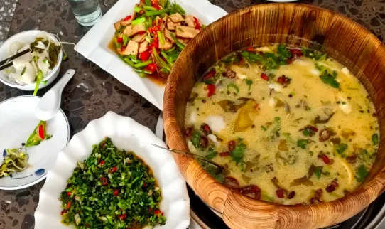 早上可以找家本地小店,吃一碗包圆,外皮软糯,里头的馅咸香带鲜,热气一扑脸,人就醒了。再配米粉或艾米果,胃里一下就踏实。中午适合点烟笋炒腊肉、黄精炖土鸡,笋是山里那种带点韧劲的脆,腊肉咸香但不硬,鸡汤入口不油,喉咙一滑,人就静下来。晚上别贪多,来份小河鱼、豆腐煲,或者农家时蔬,清口,舒服,好睡。